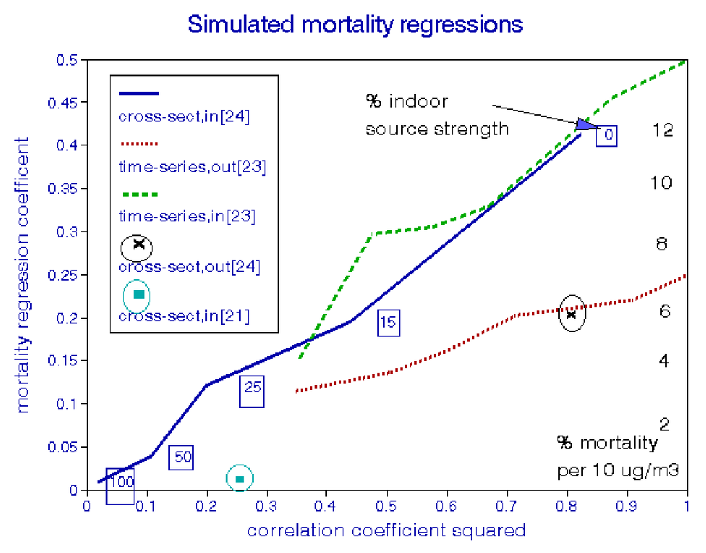 Using the indoor source distribution based on the data of Jenkins et al. [21] reduced the simulated mortality regression coefficient to essentially zero, as is the case with the full-strength data from Avery et al. [24].