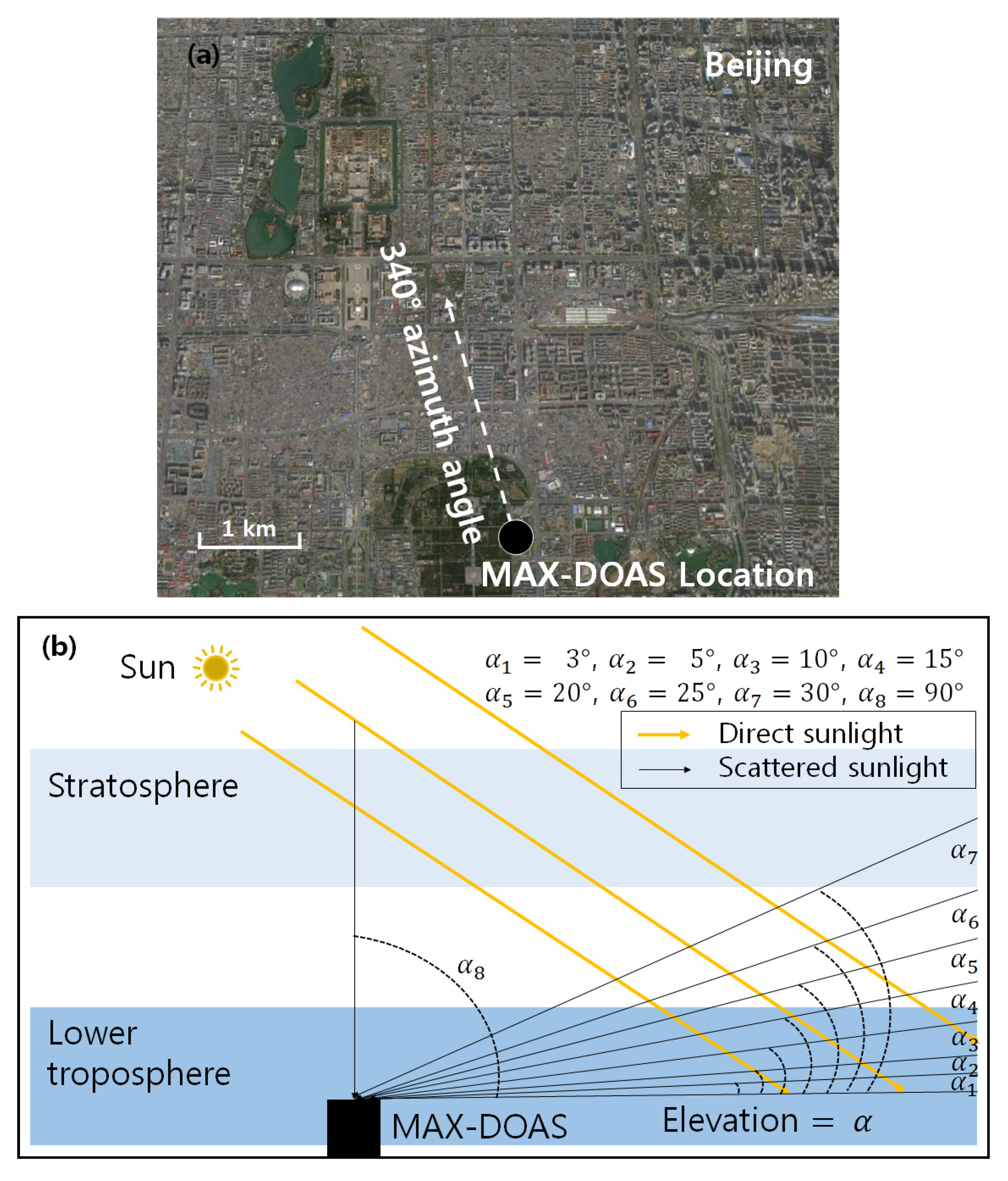 (a) Location map of the measurement site in Beijing. The direction of the MAX-DOAS measurement is indicated by the dashed arrow. (b) The MAX-DOAS observation geometry used during the CAREBEIJING campaign.