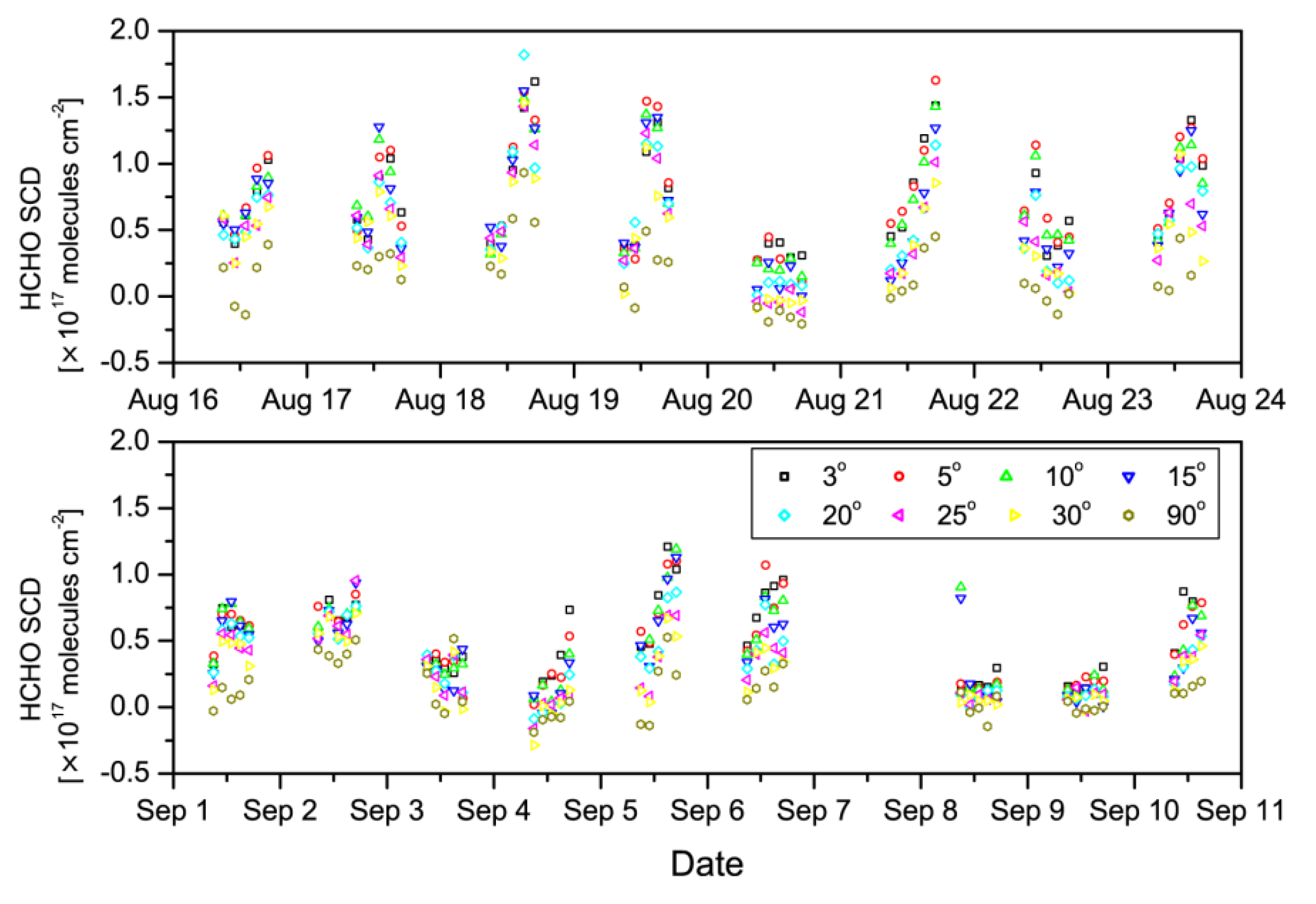 Figure 2 shows the temporal variations of HCHO SCDs at each EA, and excludes data from cloudy and rainy days. The HCHO SCD values ranged from −5.11 × 1016 to 2.30 × 1017 molecules cm−2. There are some negative O4 and HCHO SCDs as shown in Figure 2 due to the optical density fitting when the SCD of a trace gas (which is absorbed in the FRS) is smaller than that in other spectra that are to be analyzed. The high values observed at low EAs (3° and 5°) suggest higher concentrations of HCHO near the surface than at higher altitudes. HCHO differential slant column densities (DSCDs) at other EAs were then obtained by subtracting the SCD at each EA from the SCD at 90° within the same measurement loop [37].