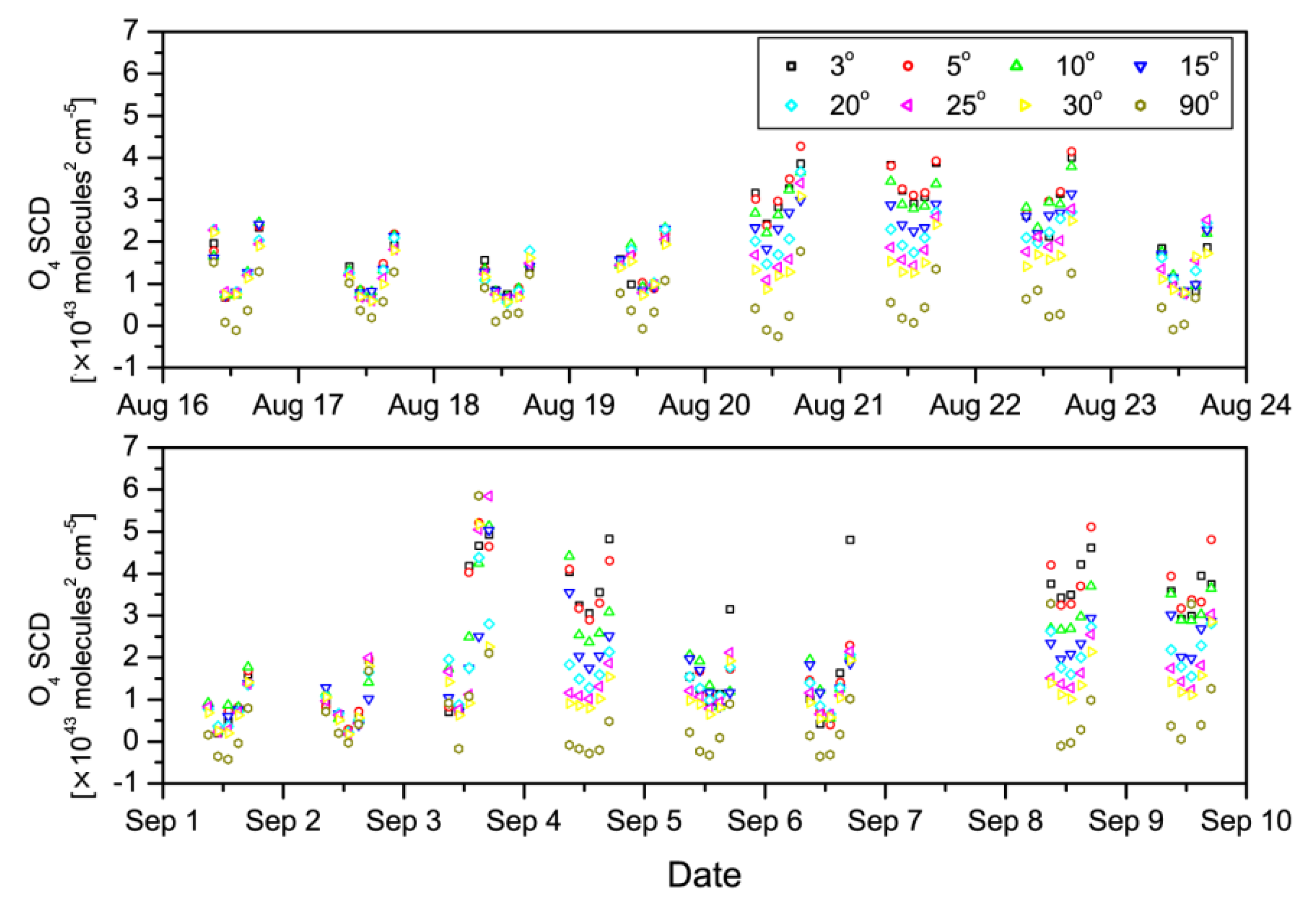 Temporal variations in O4 SCD values obtained at EA = 3°, 5°, 10°, 15°, 20°, 25°, 30°, and 90°.
