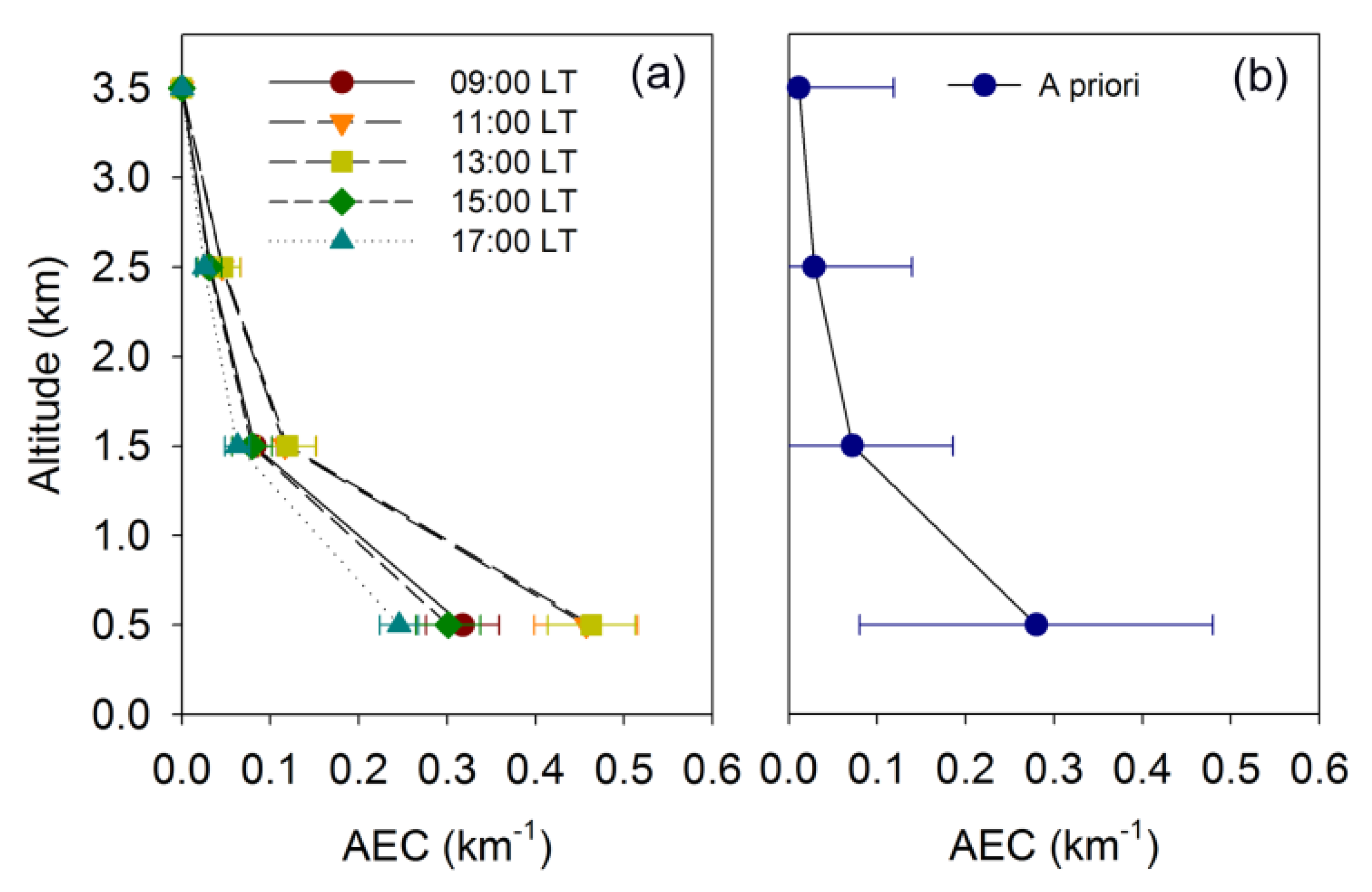 (a) Mean values of the AEC (353 nm) vertical profile with error bars obtained from MAX-DOAS measurements at different times of the day during the CAREBEIJING campaign. Error bars represent the mean errors estimated from the retrieval covariance matrix. (b) A priori AEC (353 nm) vertical distribution used in the present study.