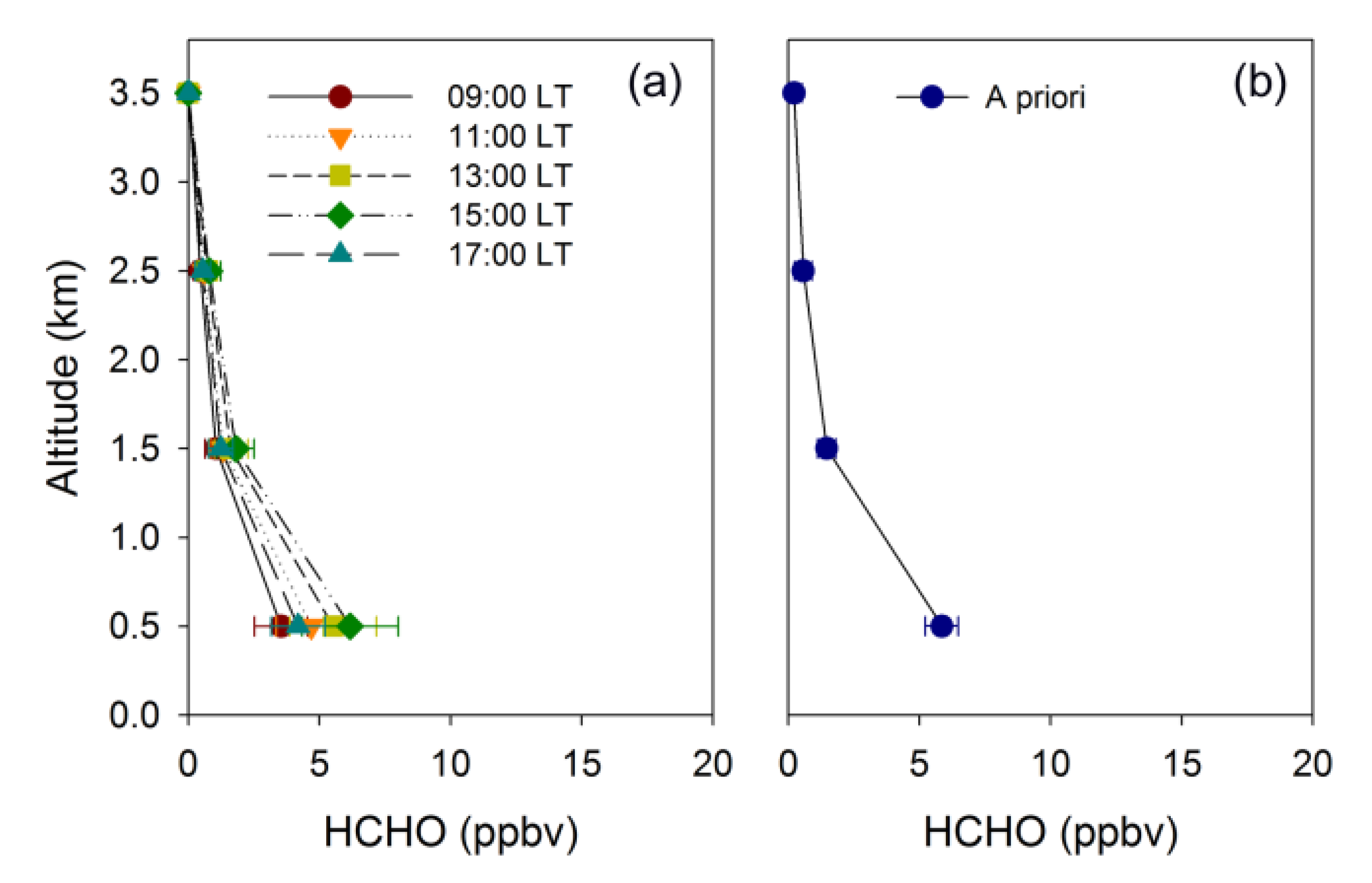 (a) Mean values of the HCHO vertical profile with error bars obtained from MAX-DOAS measurements at different times of the day during the CAREBEIJING campaign. Error bars represent the standard deviations. (b) A priori HCHO vertical distribution used in the present study.