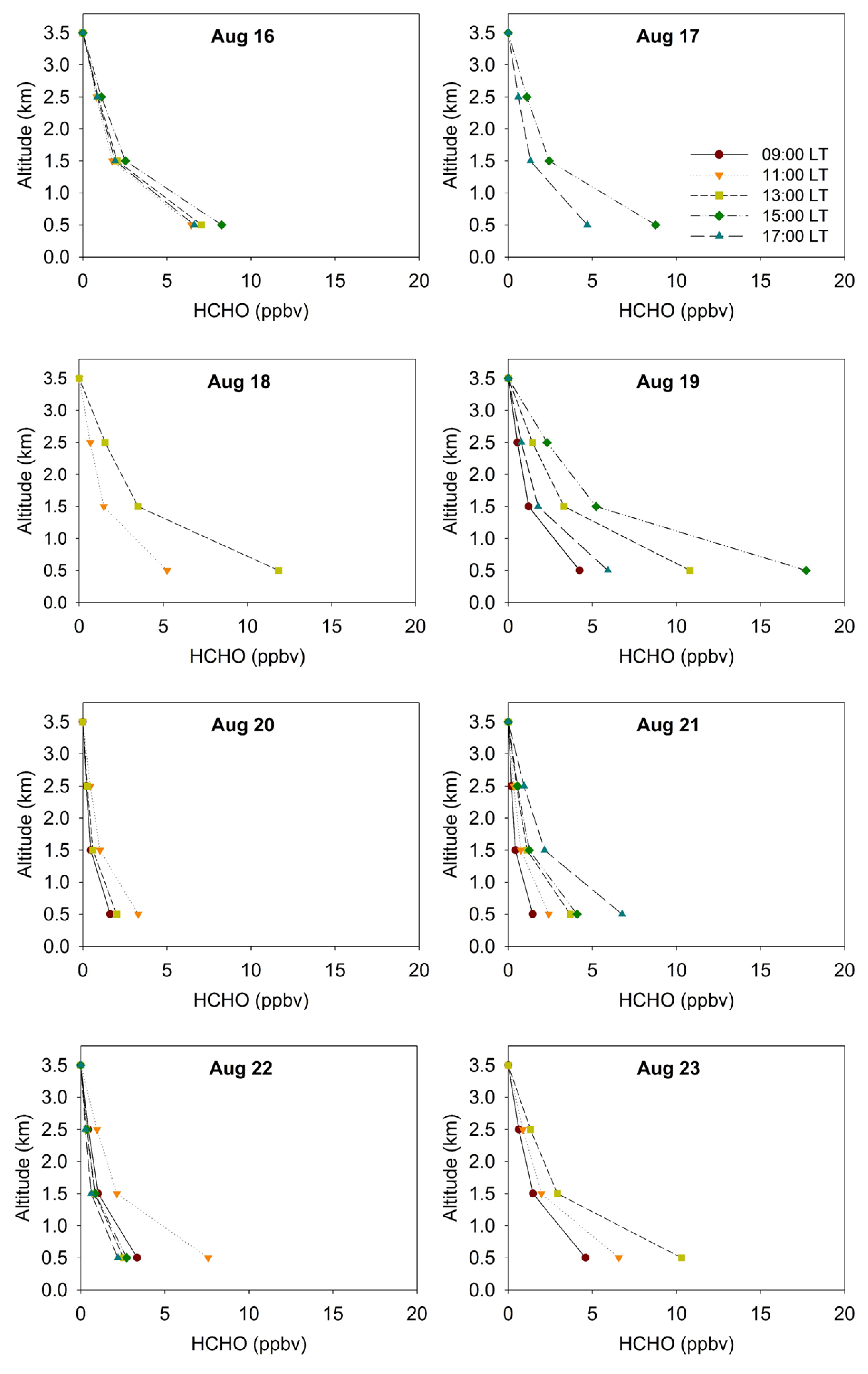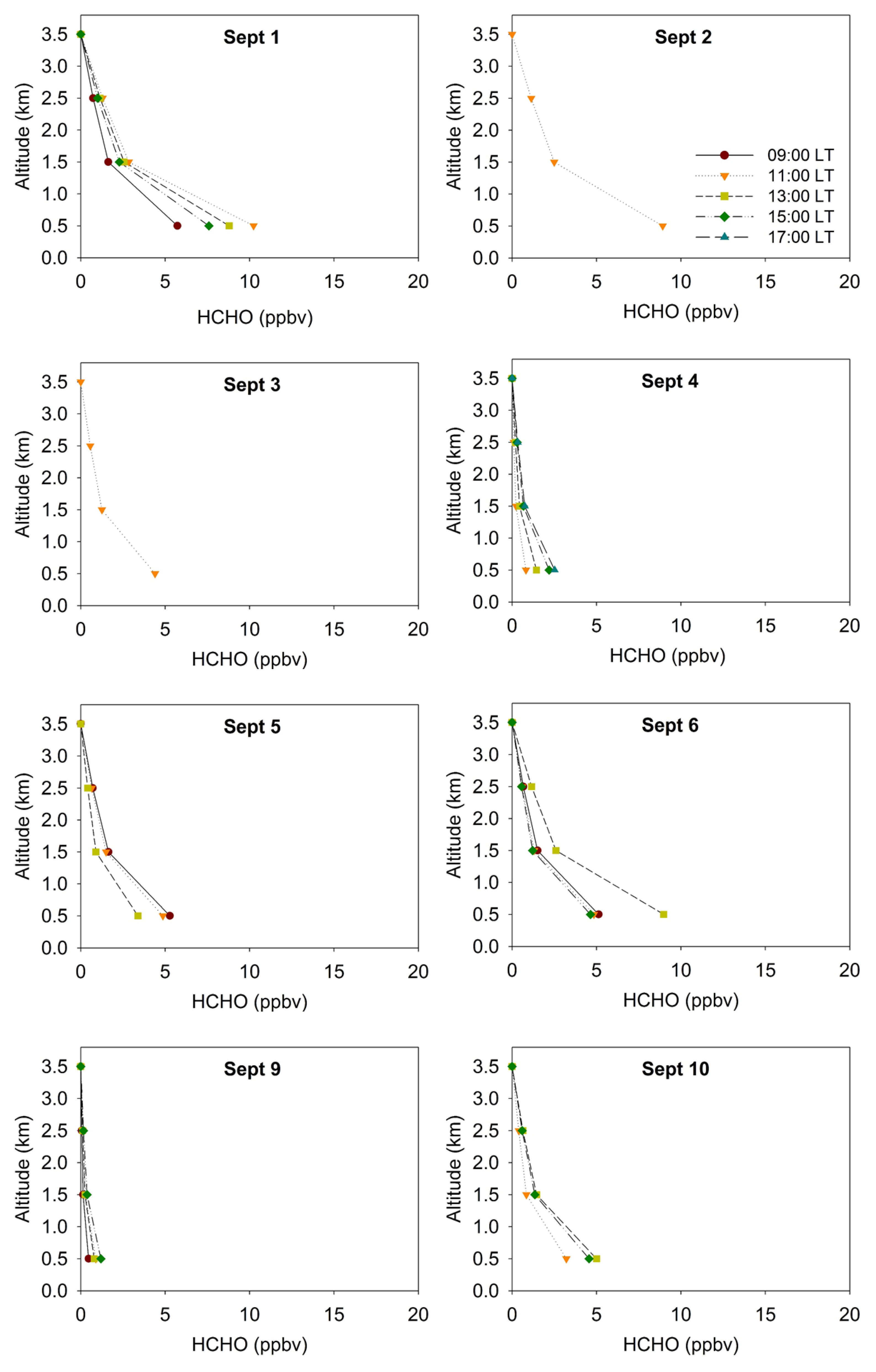 Figure 6 shows the mean diurnal variations in the vertical profiles of HCHO VMRs over the measurement period. HCHO concentrations were low at 09:00 and 17:00 LT, and were higher at 13:00 and 15:00 LT. The HCHO VMRs were 3.54, 1.06, and 0.46 ppbv for the 0–1, 1–2, and 2–3-km layers, respectively, at 09:00 LT; they were 6.17, 1.82, and 0.80 ppbv for the 0–1, 1–2, and 2–3-km layers, respectively, at 15:00 LT. The increased HCHO at 15:00 LT implies that photo-oxidation of VOCs was very rapid due to the peak solar irradiance at this point in the day. The magnitude of the HCHO variation was greater near the surface than at altitudes higher than the 0–1-km layer, as shown in Figure 6.