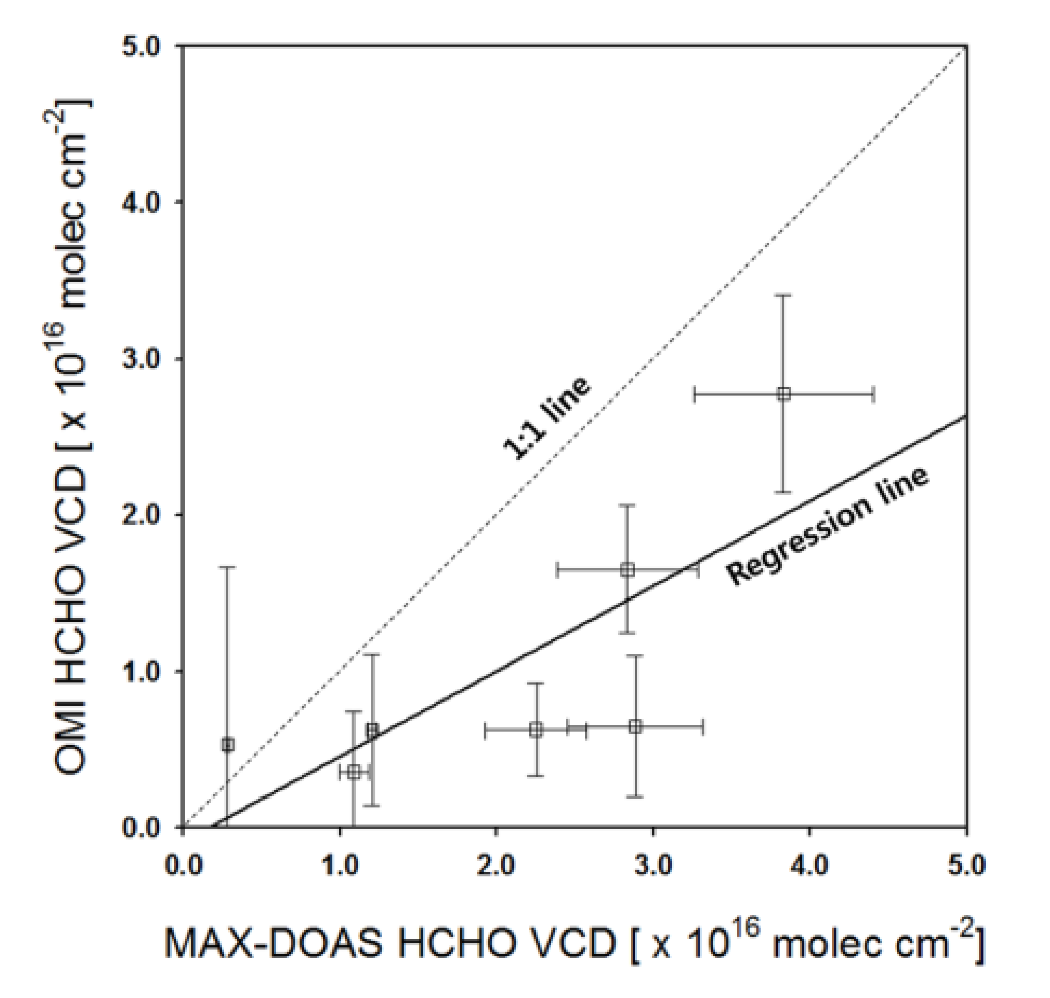 Correlations between HCHO VCDs retrieved from the MAX-DOAS measurements and those obtained from OMI measurements during the CAREBEIJING campaign. The error bars (MAX-DOAS) represent the mean errors estimated from the retrieval covariance matrix whereas the error bars (OMI) represent the retrieval uncertainties