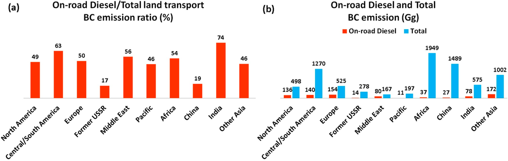 (a) On-road diesel percent fraction of total land transport black carbon (BC) emissions (regional). (b) On-road diesel and total BC emissions (Gg/yr) (regional). Adapted from Bond et al. [13].