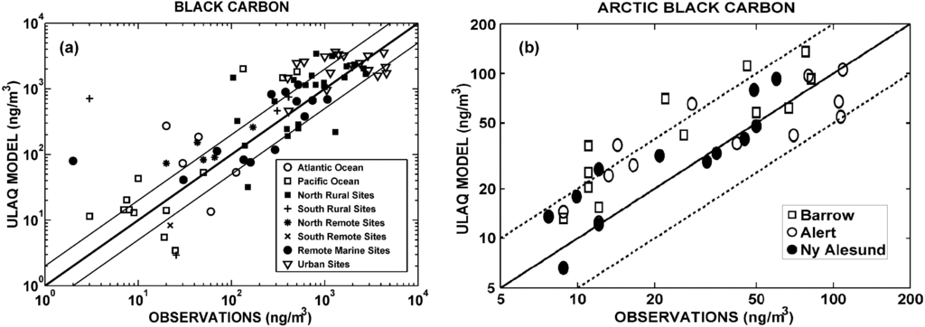 A comparison of model results for the surface mass concentration of BC with observations on selected worldwide measurement sites is presented in Figure 2a, with the thin lines highlighting a factor of two deviations. The observations used here are those referenced by Liousse et al. [45] and Penner et al. [34]. A similar evaluation of the model results is made for the Arctic region in Figure 2b, using monthly averaged values over three Arctic stations (Barrow, Alert and Ny Alesund). In this case, the observed values are decadal averages reported in Quinn et al. [46] and Sharma et al. [47]. A model overestimation is observed at Barrow during the BC peak concentration time of the year (i.e., springtime) and a systematic positive bias for the summertime minimum values at all stations (see Figure 3).