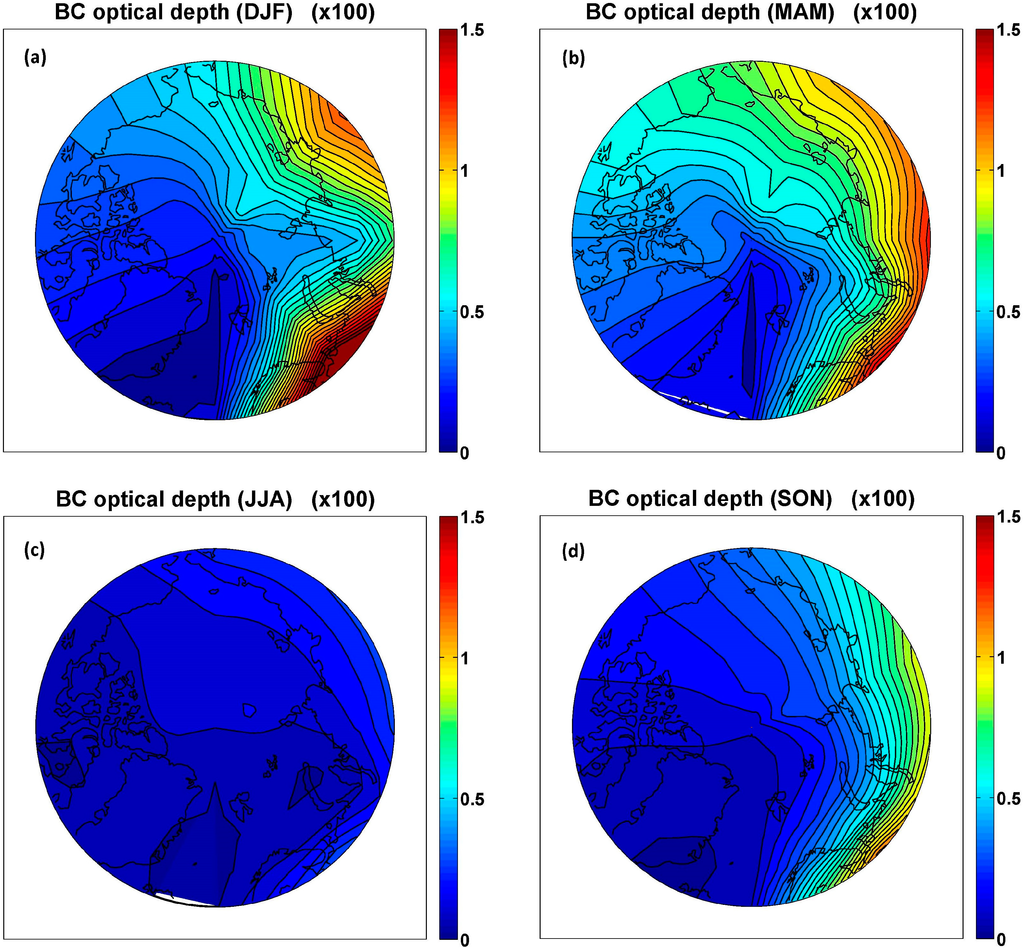The model-calculated optical thickness of black carbon aerosols and its seasonal evolution in the Arctic region are presented in Figure 4. Consistent with other model calculations [18], the larger values on the eastern Arctic and the shape of the contour lines highlight the important role of the large-scale transport of BC aerosols from Eurasian sources. Table 1 presents a summary on an annual basis of the model calculated continental contributions to Arctic BC.