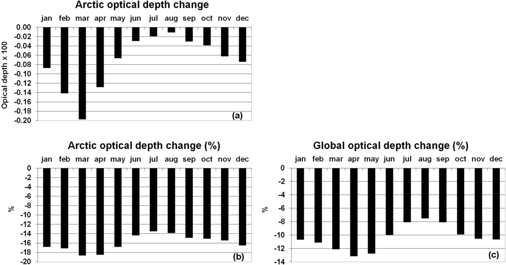 Model-calculated changes in the Arctic averaged optical thickness due to the cancellation of on-road diesel sources are shown in Figure 7a (i.e., “pert”-“base” differences) and closely follow the same seasonal cycle of the baseline reference optical depth shown in Figure 5a, with a rather flat relative decrease during the year (16.5% ± 2%) (Figure 7b). This is indirect evidence that the greatest amount of BC loading over the Arctic is transported from NH mid-latitude sources and may therefore be significantly affected by changes in anthropogenic fossil fuel burning, both in terms of decadal trends and the potential regulating measures of these emissions. On a global scale, the BC optical thickness decrease in the sensitivity experiment is calculated to be 10.5% ± 2% (Figure 7c). The decrease in the relative change in BC optical thickness during summer months (8% in July–August versus 13% in April) results primarily from the impact of biomass burning sources in Russia during these months [56]. The contribution of boreal forest fires may actually be highly variable from year to year due to different meteorological conditions. The ULAQ model does not consider this interannual variability, because it uses a climatological inventory dataset for open biomass burning emissions.