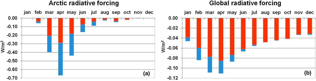 Except when specified, RF values discussed in this section are calculated in total sky conditions at the tropopause. The Arctic regional radiative forcing associated with the BC perturbation described above is shown in Figure 8a, whereas Figure 8b refers to the globally-averaged RF; here, the direct radiative impact is shown along with the BC snow-albedo forcing. The springtime peak in Arctic BC RF (Figure 8a) is due to coupling of the maximum optical depth change and the incoming solar radiation increase with respect to the winter months (see Figure 5a). As pointed out in Flanner [20], April–May tropospheric BC induces the greatest normalized radiative impact in the Arctic, because high insolation and surface albedo help reach a large specific forcing. According to the model, the average direct RF in the Arctic during March-April-May amounts to −0.22 W∙m−2, to be compared with an annual global average of −0.054 W∙m−2 and an annual Arctic average of −0.074 W∙m−2 (see Table 2). Including the BC snow-albedo forcing, these RF values increase to −0.50, −0.064, −0.16 W∙m−2, respectively.