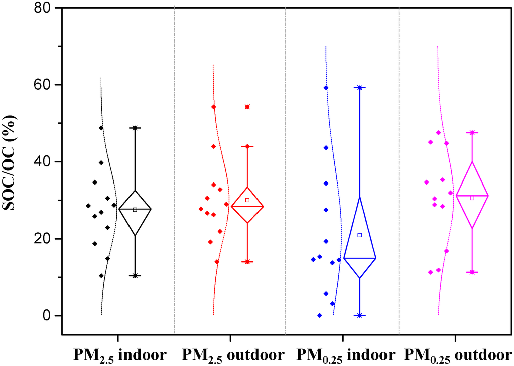 Box plots of SOC/OC (%) in PM2.5 and PM0.25 inside the classroom and outdoors.