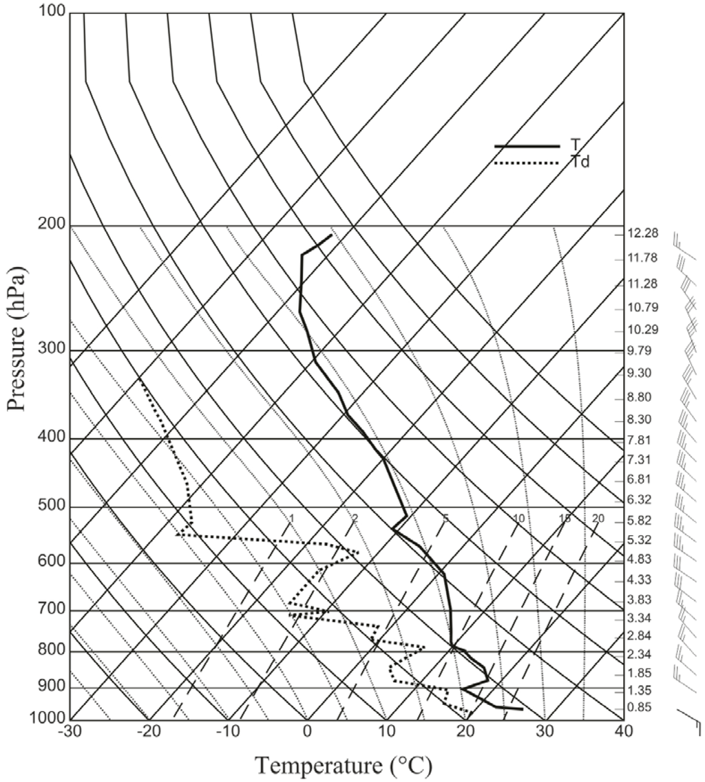 The base state was horizontally homogeneous and it was obtained from a single sounding of which the skewed-T/log p thermodynamic diagram is presented in Figure 1. The wind direction strongly changed (from southeast to northwest) from the surface to 1 km above ground level. The prevailing wind was in a northwest direction. The wind speed increased from the ground (approximately 7 m·s−1) with altitude to approximately 17 m·s−1 at 9 km above ground level. There was a large moisture content under approximately 3 km above ground level. The water vapour mixing ratio reaches a maximum value (approximately 13 g·kg−1) at a level of 900 mb. These environment characteristics are typical for the evolution of severe storms over the region of Western Serbia [35].
