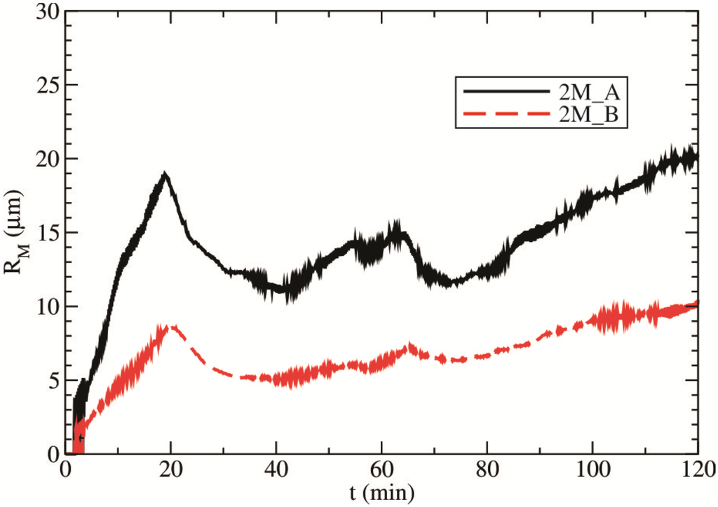 The evolution of the mean radius of the entire drop spectra RM (in μm) for nc = 60 cm−3 (experiment 2M_A) and nc = 600 cm−3 (experiment 2M_B). The mean values of the radius RM are presented (within the cloud volume).