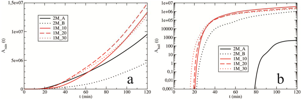 The evolution of the surface precipitation is shown in Figure 3. The amounts and timing of the occurrence of (a) rain and (b) hail accumulations over the model area are discussed. The evolution is presented for the double-moment bulk microphysical scheme (experiments 2M_A and 2M_B) and for the single-moment scheme (experiments 1M_10, 1M_20 and 1M_30). The single-moment scheme generally allows more rain to reach the ground than the double-moment scheme in the late stage of the cloud (Figure 3a). Additionally, the regularity between the amounts of surface precipitation and changes in the values of the mean drop radius was not observed in Figure 3a for the single-moment experiments. In contrast, in the experiments with the double-moment scheme, an increase in the cloud droplet number concentration (analogous to the decrease in the mean drop radius) leads to a large reduction in the rain accumulation on the ground. Therefore, the case with the 10-fold higher concentration of cloud droplets (2M_B) results in an approximately two-fold smaller amount of rain at the surface compared with test 2M_A.
