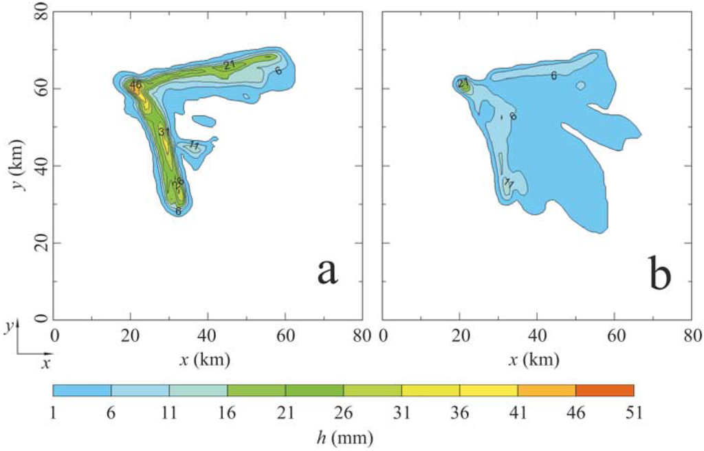 The horizontal distribution of the total surface precipitation of the double-moment scheme at t = 120 min for experiment (a) 2M_A and (b) 2M_B. Isohyets are drawn at 5 mm; the base isohyet is 1 mm. The height of accumulated precipitation on the ground h (in mm) is represented using a scale at the bottom of the figure.