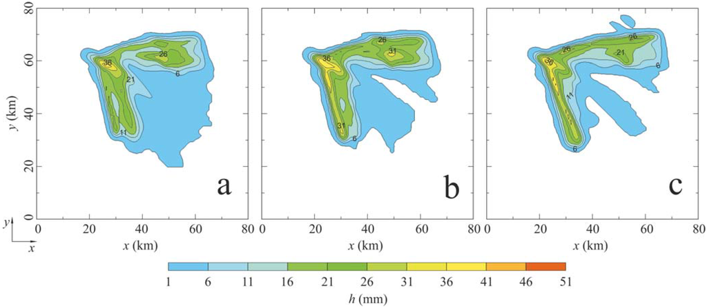 Figure 4 depicts a horizontal distribution of the overall surface precipitation (in mm) for the double-moment scheme at the end of the time integration. Note that experiment 2M_A generates narrow bands of intense rainfall, while these rainbands disappear and the precipitation field is more uniform in experiment 2M_B. Similarly, Figure 5 shows the total precipitation field for the single-moment scheme. In this case, the precipitation field is characterized by slightly wider rainbands that spread over a large horizontal area. The horizontal distribution of the surface precipitation is less sensitive to a change in the parameter RM than the results displayed in Figure 4. Similarly, Ćurić et al. [8] concluded that the single-moment bulk scheme with the Khrgian-Mazin distribution produces more cumulative rainfall over a large area than other cases.