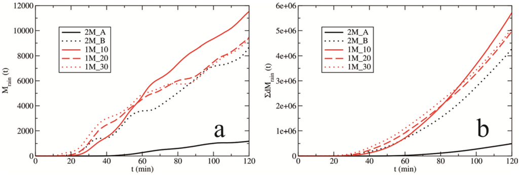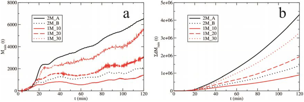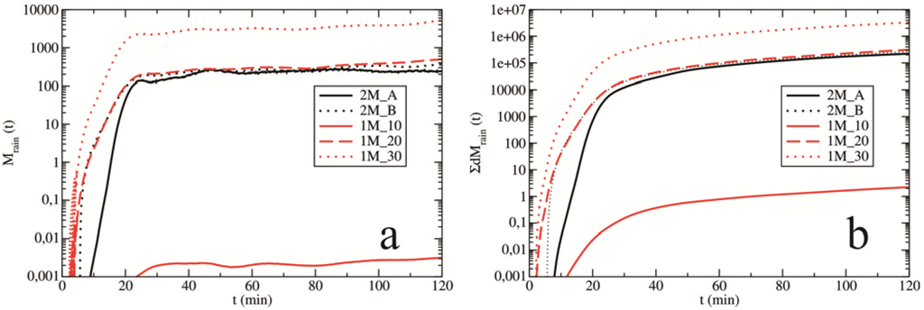 Initially, raindrops are formed by random collisions of cloud droplets which present autoconversion. In Figure 6, the autoconversion mass contribution to the raindrop production as a function of time for all experiments is depicted. All sensitivity tests well simulated this microphysical process by varying the mean radius of the drop spectra (experiments with the single-moment scheme) or analogously by changing the values of the cloud droplet number concentration (tests 2M_A and 2M_B). Namely, when the mean cloud droplet size is large, droplets are more likely to quickly transform into raindrops, which is analogous to a smaller concentrations of cloud droplets. Conversely, a higher cloud droplet number concentration leads to a slower transition of cloud droplets to raindrops for a given cloud water mixing ratio.