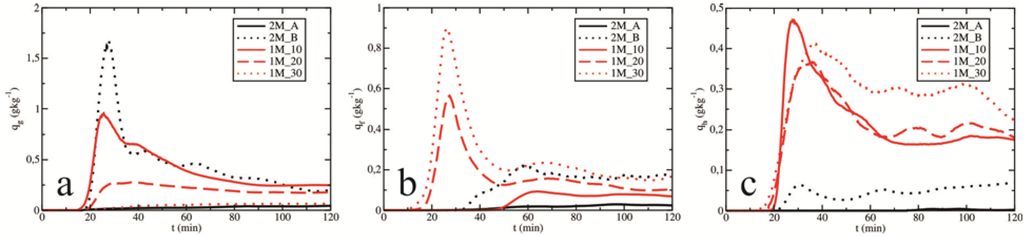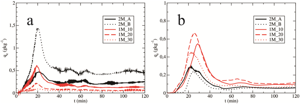 Raindrops (formed by the autoconversion of cloud droplets or by the melting of solid precipitating elements) can further grow by collecting cloud droplets. Figure 7 presents the mass contribution to rain by the accretion of cloud droplets over time. Similar dependences were observed for experiments 2M_A, 2M_B and 1M_20. A very small mass contribution to rain can be observed in 1M_10. The overall mass contribution (expressed by the cumulative sum) is only ~2 t, whereas the total mass contributions in other sensitivity experiments are over 105 t. Figure 8 presents the mean values of (a) the cloud water mixing ratio (qc) and (b) the rainwater mixing ratio (qr) as a function of time for all sensitivity experiments. The values of the cloud water mixing ratio are generally higher for the double-moment experiments (especially for experiment 2M_B) compared with the single-moment experiments. Differences are most obvious in the early stage of a cloud’s life. Higher values of qc for the experiment 2M_B (Figure 8a) are the result of the reduced autoconversion of cloud droplets to rain (Figure 6). In all experiments, as the cloud droplet number concentration increases (or as the mean radius decreases), there is more cloud water available due to the reduced autoconversion. Rainwater mixing ratios have approximately the same values, particularly in the later stages of a cloud's life (for all experiments).