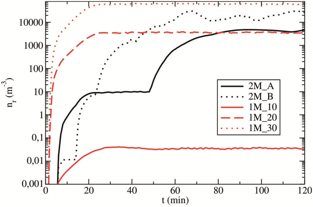 Figure 9 shows the maximum values of the rain number concentrations prognostically calculated in the double-moment scheme (2M_A and 2M_B) and diagnostically defined in the single-moment model (1M_10, 1M_20 and 1M_30) with the unified Khrgian-Mazin size distribution: