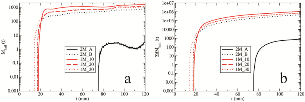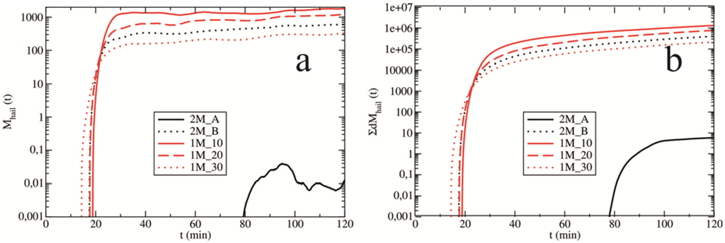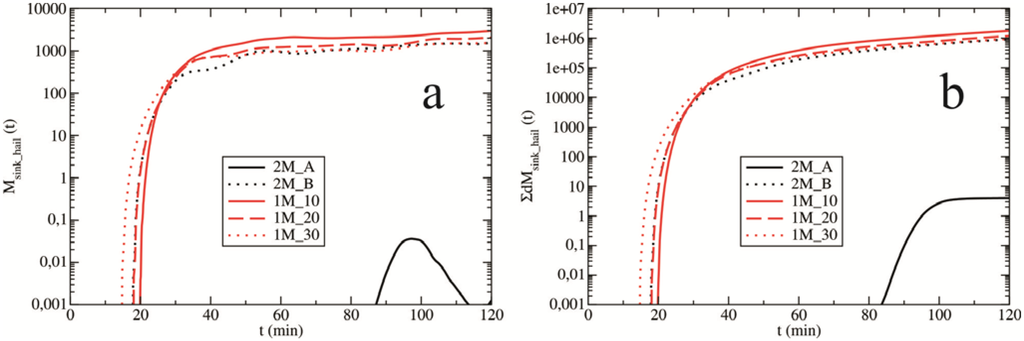 Considering the amounts of hail on the ground (Figure 3b), the single-moment scheme simulates a larger amount of surface hail than the alternative scheme (especially for experiment 2M_A). The most obvious difference between the sensitivity tests created by the single-moment scheme and the double-moment scheme is for the case with nc = 60 cm−3. An increase in the cloud droplet number concentration by a factor of 10 leads to an approximately 2500-fold increase in the amount of surface hail in experiment 2M_B. Additionally, the appearance of hailstones at the surface (in experiments 1M_10, 1M_20 and 1M_30) occurs much earlier than in experiment 2M_A. Experiment 2M_B is characterized by a much earlier appearance of surface hail, which is similar to the single-moment experiments. Examining the evolution of the surface hail (amounts and timing), the double-moment scheme is more sensitive to the increasing cloud droplet number concentration (or mean radius of the drop spectra) compared with the single-moment scheme. Therefore, experiments created by the single-moment scheme show slight sensitivity when changing the mean radius of the drop spectra RM.