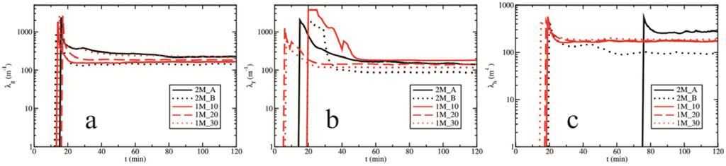 Hailstones are initially formed by the autoconversion mechanisms of graupel and frozen raindrops. The total contribution of the two processes to hail formation is shown in Figure 13. Figure 13 depicts (a) the current mass contribution to the hail field and (b) the corresponding cumulative sums for all experiments. The mass contribution had a low sensitivity following the experiments simulated by the single-moment scheme. Additionally, the values of the mass contribution are generally greater than those produced by the double-moment scheme. Figure 14 presents the mean values of the slope parameter λ (derived from Equation (9)) for (a) graupel; (b) frozen raindrops and (c) hail over time. The values of the slope parameter were averaged over all grid points for which hailstones were present. The autoconversion of graupel (Pgauth) and frozen raindrops (Pfauth) to hail are inversely proportional to 1/λg4 and 1/λf4 [5,21]. The values of the slope parameters λg and λf (for the single-moment scheme) lie between the corresponding values for the double-moment scheme over most of the time integration. Based on these values, it was expected that the autoconversion rates for the single-moment scheme would lie between the corresponding rates for the double-moment scheme, but this did not occur (Figure 13). The slope parameter for category X (in the single-moment scheme) is proportional to the mixing ratio, whereas in the double-moment scheme the slope parameter is influenced by two microphysical fields: the mixing ratio and the number concentration. Thus, the mass contributions caused by the autoconversion of hailstone embryos to hail (see Figure 13) for the single-moment scheme are higher than those of the double-moment scheme, particularly for experiment 2M_A. In the case of 2M_B, a larger content of available cloud water (smaller Praut; see Figure 6) leads to stronger riming of hailstone embryos and rapid transitions to hail via autoconversion.