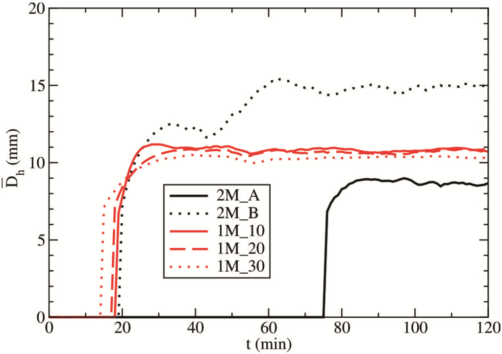 The mean diameter of hailstones Dh (in mm) as a function of time for all experiments. The mean values of the hail diameters are presented.