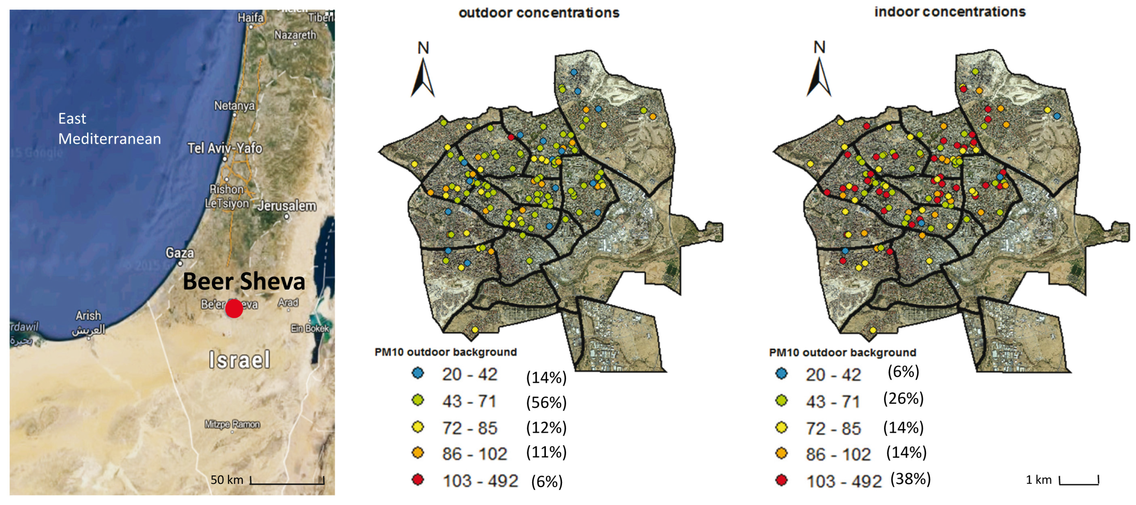 Measurement locations of outdoor (left) and indoor (right) PM10 concentrations during background (non-dust days) in Beer Sheva. The different dot colors represent the PM levels from lowest (cold colors) to highest (warm colors) concentrations. Concentrations are given in μg·m−3. Percentages in brackets indicate the relative fraction of houses within the indicated particulate matter (PM) concentration range.