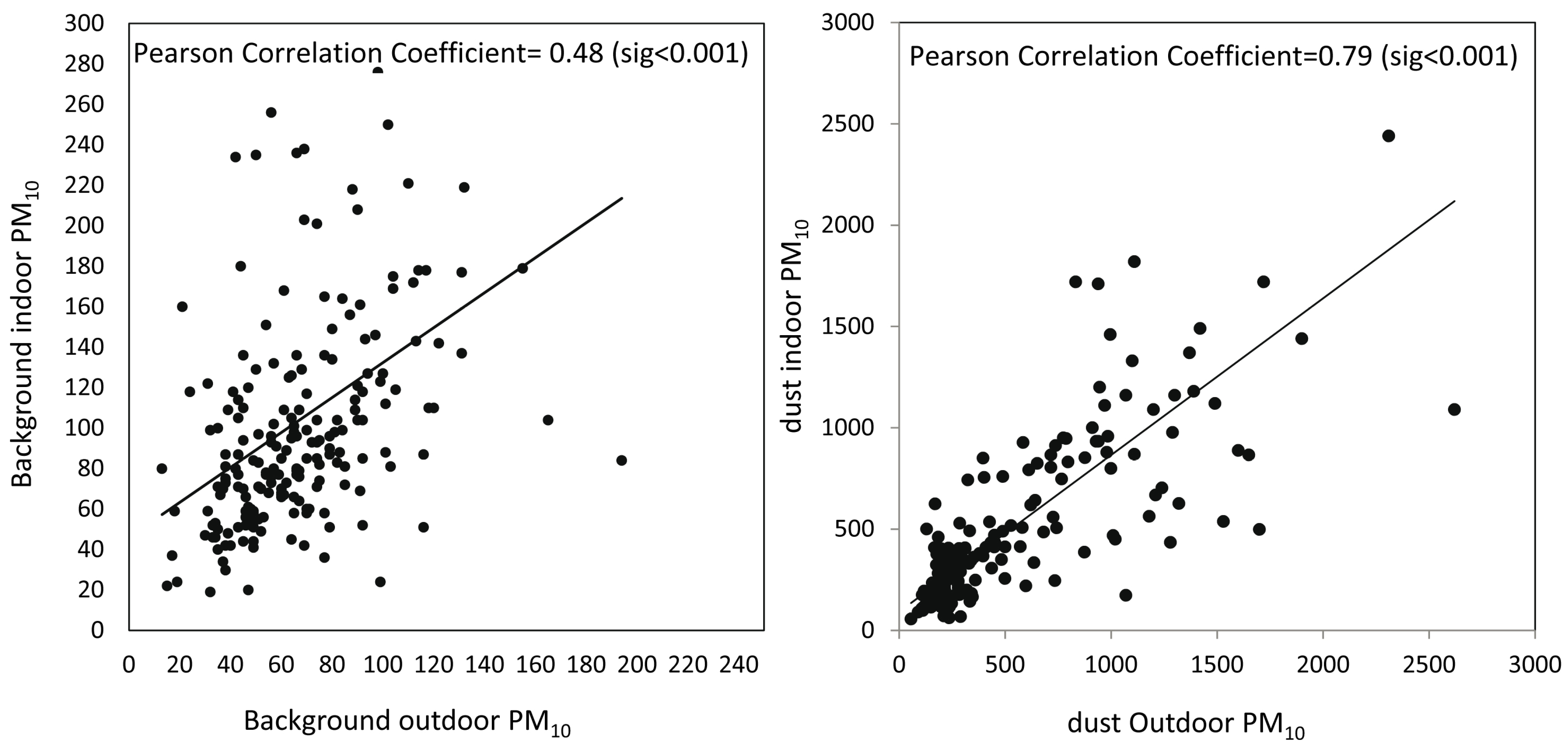 The correlations coefficient between the indoor and outdoor PM10 was calculated (Figure 2). During the background period, the correlation coefficient was relatively weak −48% (sig < 0.001), indicating that the house conditions are a more dominant effector on the indoor PM concentrations. However during elevated PM concentrations following dust storms the PM10 concentrations increased significantly above the background values (up to 2300 μg·m−3). The correlation coefficient during dust events increased to 79% (sig < 0.001). This is related to the atmospheric (outdoor) PM as a major controlling factor on indoor PM during dust events.
