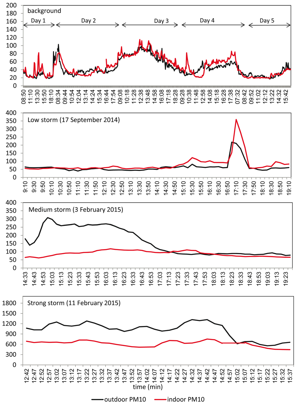 Figure 3 also shows the indoor and outdoor concentrations during dust storms with different intensities. The low intensity dust storms of September 2014 reached atmospheric (outdoor) concentrations of 220 μg·m−3 after an initial background value of about 50 μg·m−3. The dust event lasted for about an hour before the background value was reduced again to the level of 50 μg·m−3. The corresponding indoor concentrations during the background were slightly higher than those of the outdoor and reached 360 μg·m−3 during the dust event itself (correlation 86%, sig < 0.001). The increase in the indoor concentration occurred 10 min after the beginning of the dust event, and decreased to the background values about 30 min after the end of the event.