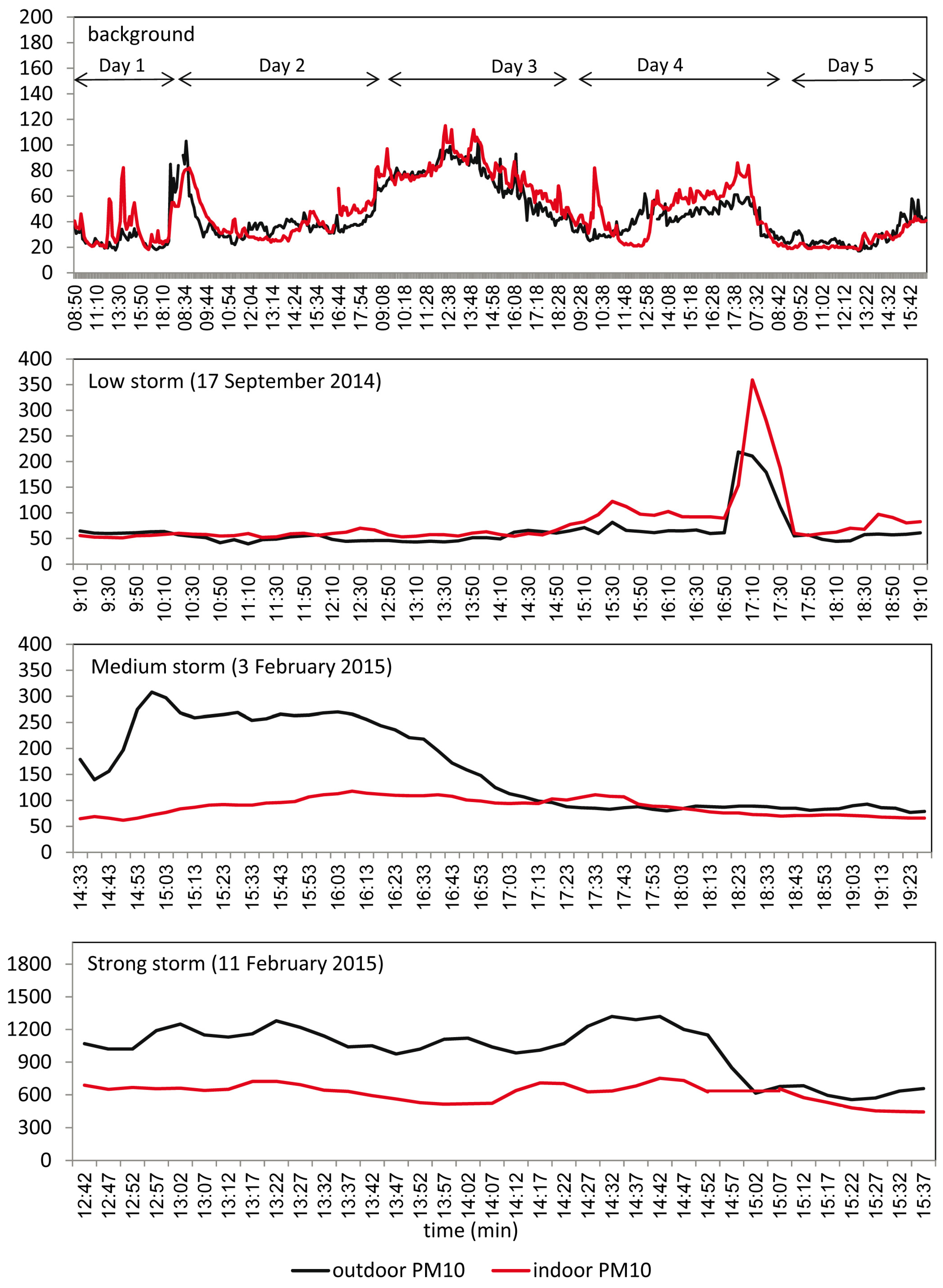 PM10 concentrations in a typical house during background (upper graph) and different dust event levels (low, medium, high). The background measurements were collected during several days. Note the differences in Y axis scales.