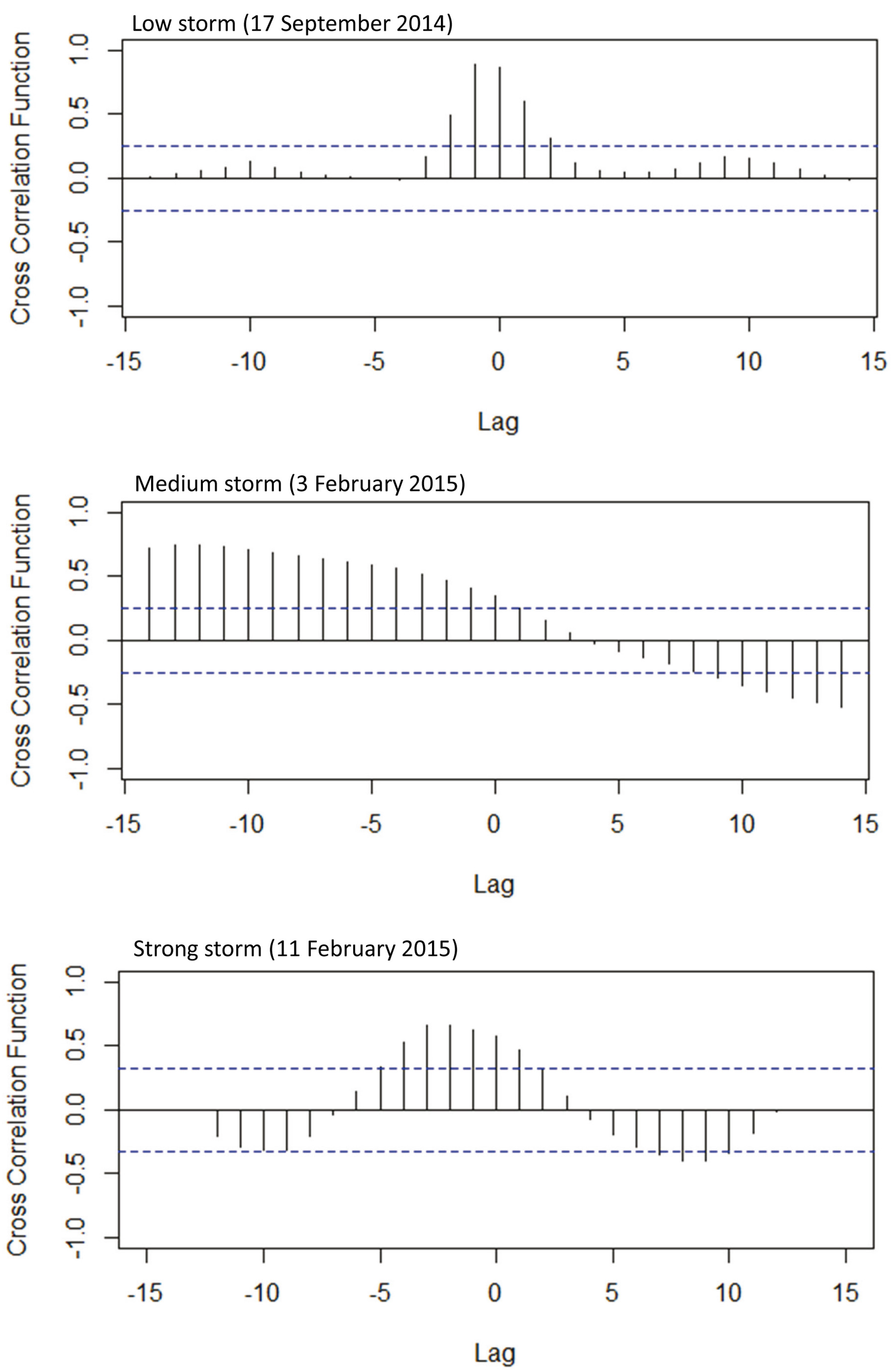Cross correlation function between indoor and outdoor concentrations for the different storms. Correlation coefficient between outdoor and indoor PM measurements are (sig < 0.001): 86% (17 September 2014); 43% (3 February 2015); 70% (11 February 2015).