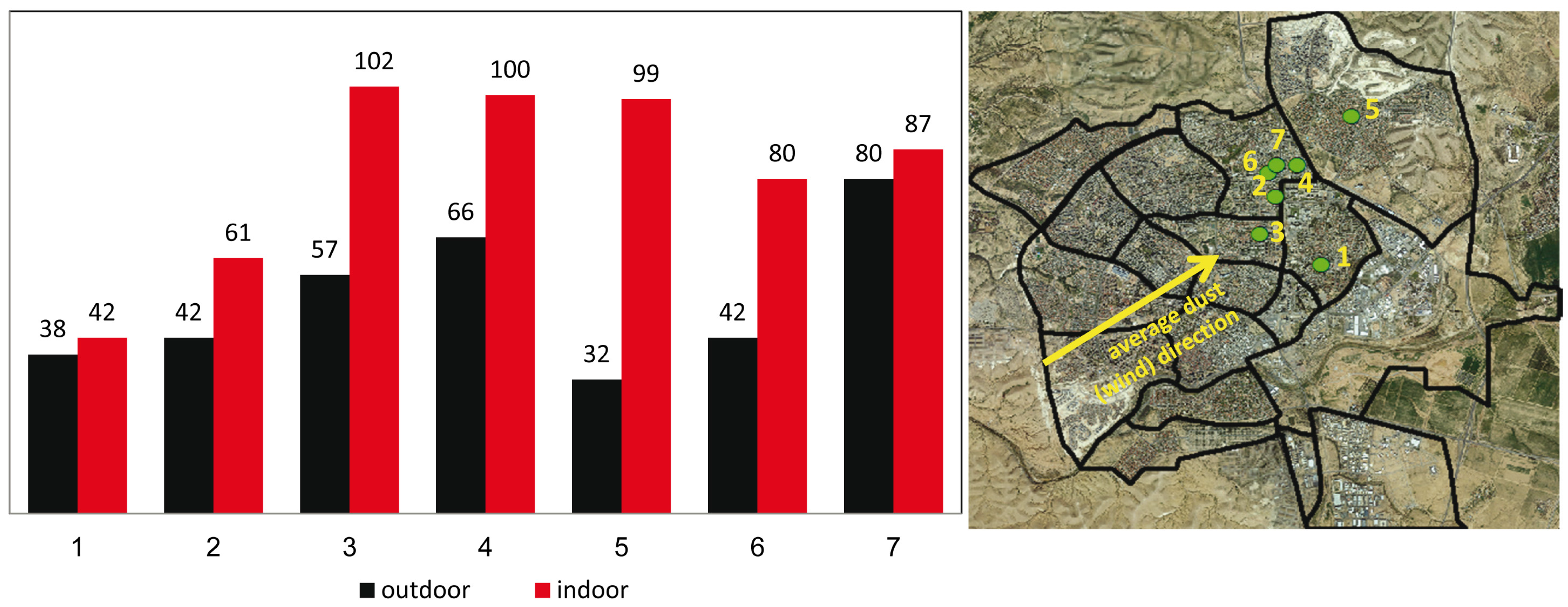 To further examine the indoor PM response to dust events, we compared the results of 7 houses during different dust events. The background levels recorded for indoor and outdoor environments of these houses are presented in Figure 5 along with the locations of the houses and the main wind direction (and dust sources) in the study area. Outdoor PM10 concentrations during non-dust days ranged between 32–80 μg·m−3. The lowest outdoor concentration was observed in house #5, which is located relatively far from the dust sources. The highest concentration was measured in house #7. Indoor levels were within the range of 42–102 μg·m−3. The lowest concentration was recorded in house #5, while the highest was measured in houses #3 and #4.