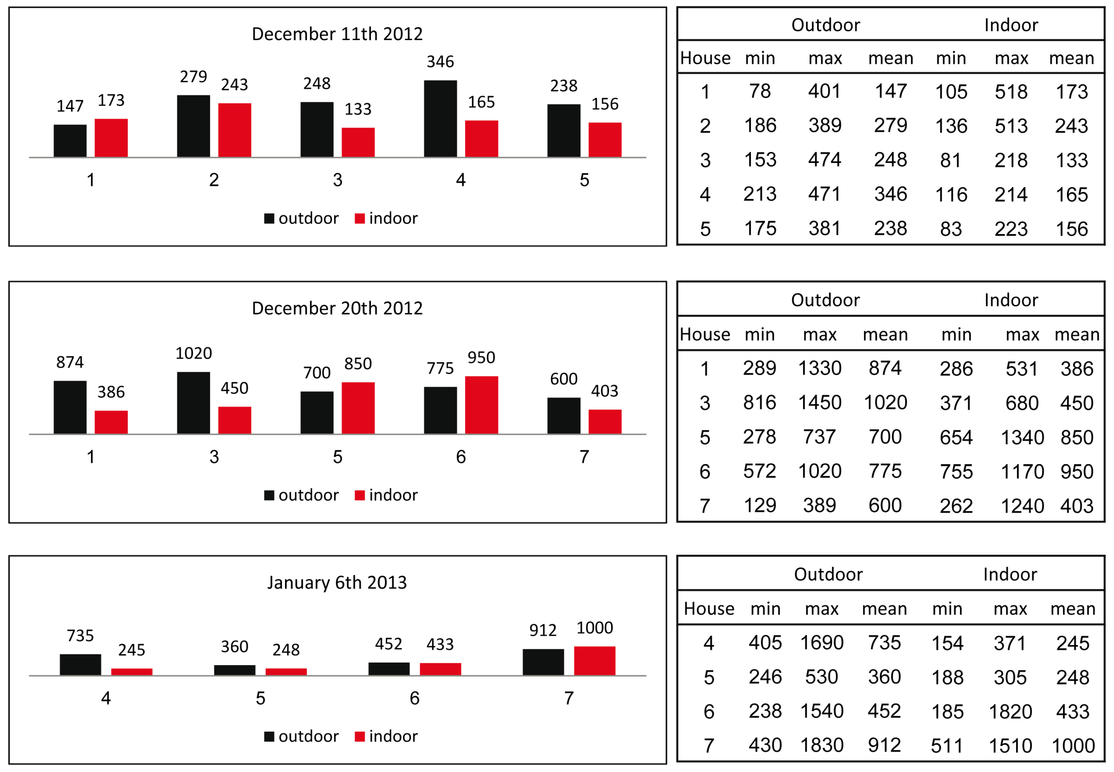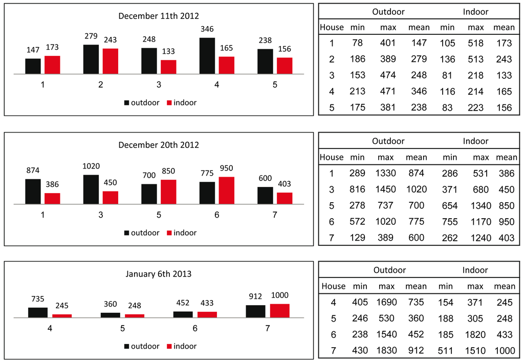 The dust events of 20 December 2012 and 6 January 2013 were high intensity storms. Both dust events lasted more than 10 h. Average outdoor PM10 concentration for 20 December 2012 was 1133 μg·m−3 with a maximum hourly value of 1290 μg·m−3. Very high outdoor and indoor concentrations were recorded in the five measured households. The highest outdoor level (1020 μg·m−3) was found in house #3; while house #7 had the lowest level (600 μg·m−3). In two of the houses (#1 and #3) the outdoor values were above 800 μg·m−3 and higher than the corresponding indoor concentrations. The I/O ratio was 0.79 on average.