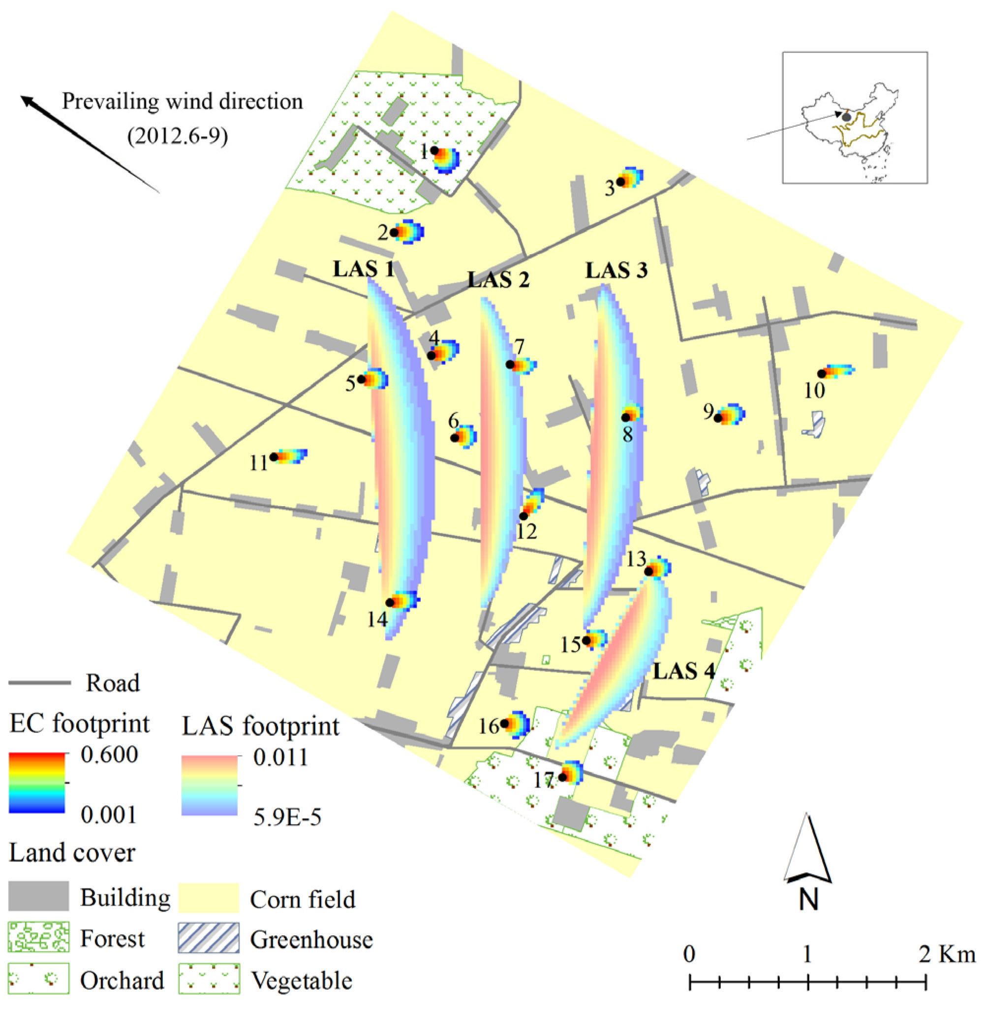The footprint model can quantitatively define the contribution of different source areas. The usefulness of the models might not be obvious when surfaces are homogeneous. However, this research shows that on a heterogeneous surface, because different types of sources have different water and heat conditions, weighted averages become more important in estimating upscaled heat flux. Compared with the above upscaling methods, the proposed regression kriging considered three important aspects of important information at the same time: (1) footprint weights of EC and LAS are considered in the aggregation of both H-fluxes and related independent variables; (2) a multiple linear model is used to capture daily large-scale spatial trends and patterns; (3) spatial autocorrelation is found between the local scale residues, and it is used to interpolate the corresponding LAS-scale residue.