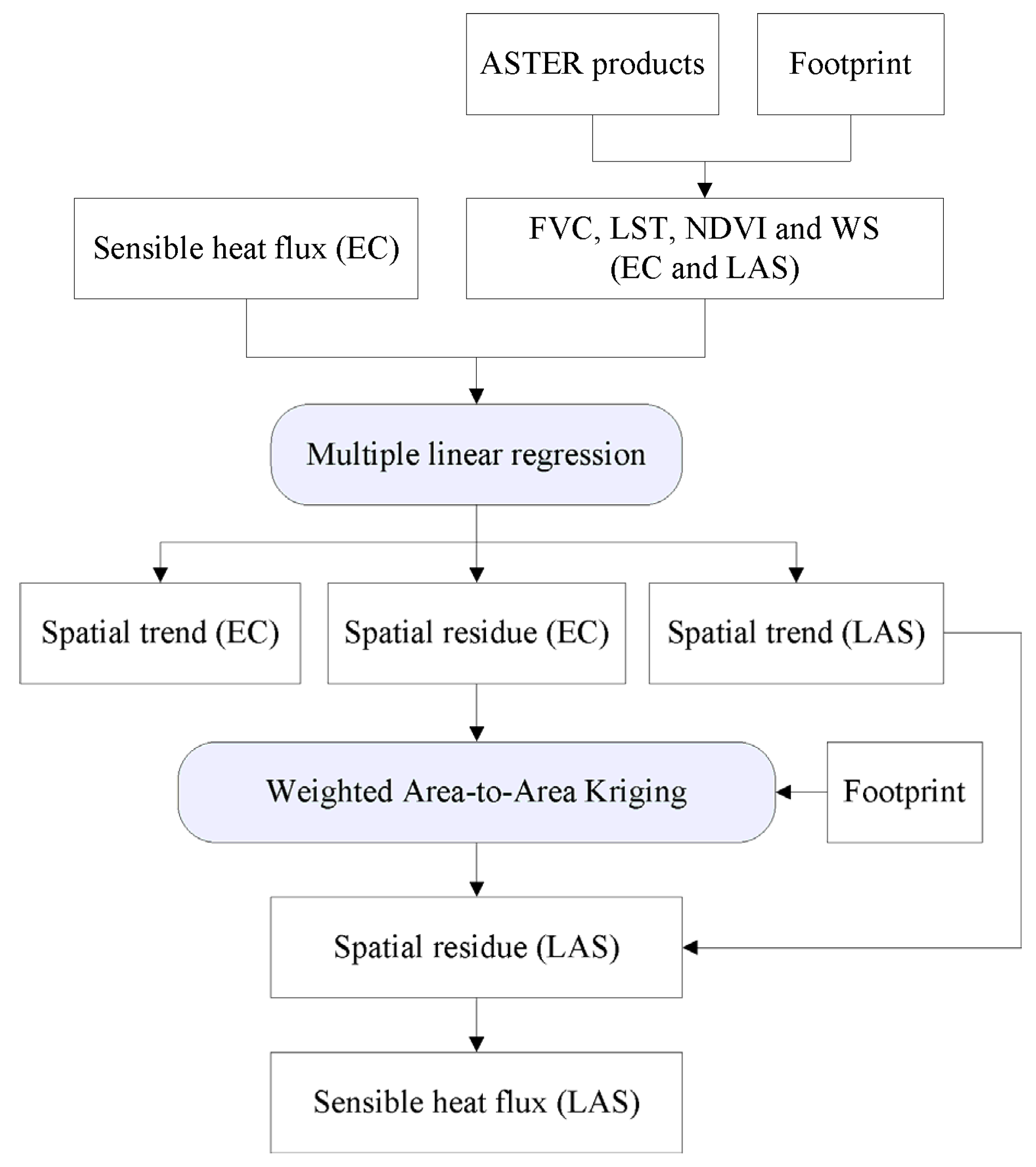 Sensible heat flux has attracted great attention in RS because of its importance in quantifications of land surface water and heat balance. Different scales of observation are possible when measuring H. EC and LAS are two of the most popular measurements. RS provides numerous products [4,5,35]; however, the validation of large-scale observations and products is a necessary first step in their application to different domains. Although many scaling methods are available for aggregating EC-scale H to LAS-scale H (e.g., area-weighted, footprint-weighted, and ATA kriging), we propose a WATA RK model for H aggregation, which was found to improve the accuracy of H estimations. The object of the model is to upscale EC-scale H to LAS-scale H but not for mapping the spatial distribution of H flux. The method includes three main steps: first, the spatial trend of H should be extracted using a weighted regression model; then, the residual of LAS H can be estimated with a WATA kriging; finally, the LAS H can be estimated by combining the two parts. We suggest that this method is applicable for other scales of H aggregations and validations of RS products. In particular, it is suitable for complicated and irregular surfaces where the component source areas have different water and heat conditions. We will further validate and test different scale RS products based on the proposed method.