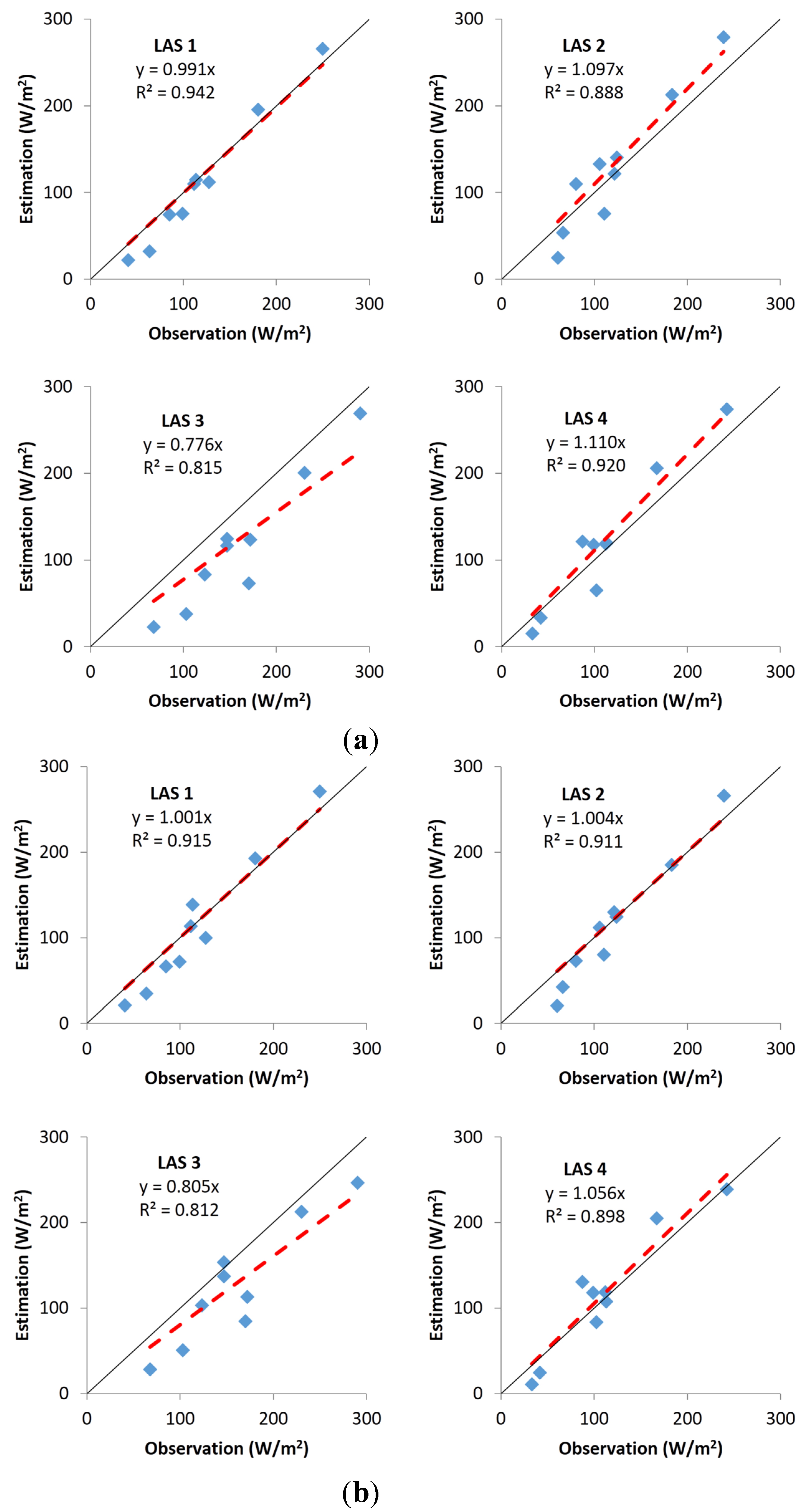 H is over-estimated for LAS2 and LAS4, whereas it is under-estimated for LAS3. The residual part of LAS H is then estimated from the 17 EC H residuals by the above WATA kriging model. The final estimated result is obtained by adding the regression and interpolation parts. A comparison with observed values is shown in Figure 3b. There are obvious improvements compared with the regression. For both LAS1 and LAS2, the red dashed lines are almost coincident with the black lines. The slope value of LAS4 is 1.056 (i.e., very close to 1). From Figure 3a, it can be found that the overestimation is mainly caused by the regression part in the two-step modeling. After applying the WATA kriging to the regression residue and adding the result to the regression result, the overestimation is decreased at both LAS2 and LAS4. However, the under-estimation phenomenon still exists in LAS3, even though the slope is increased from 0.776 to 0.805. The most important reason for this may be a systematic bias between the LAS and EC values owing to the large number of buildings in the LAS source area [20]. The high H resulting from buildings can be captured by the LAS, but it is not captured by EC because almost all EC systems are located within corn fields.