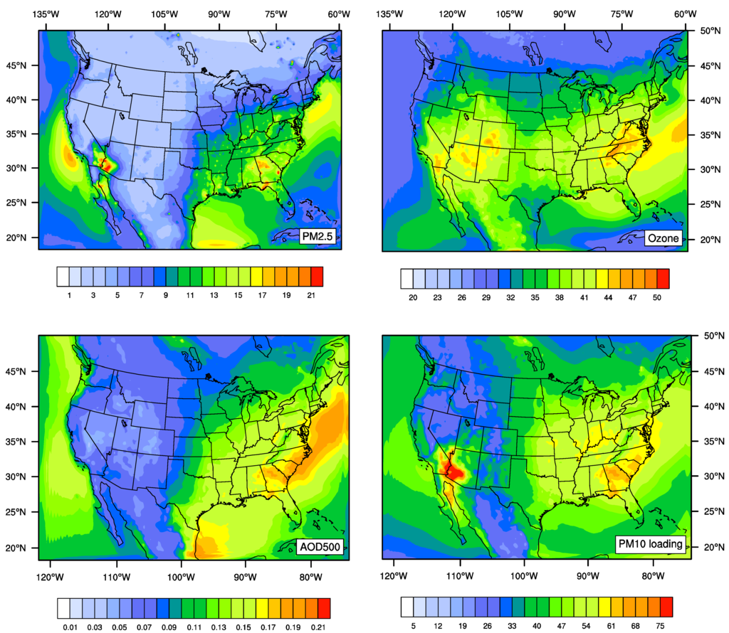Figure 2 illustrates the spatial distributions of the three-month average surface PM2.5, ozone, column AOD at 500 nm, and PM10 loading. Sea salt contributed mostly (>90%) to the high PM2.5 concentrations simulated over the Pacific near the U.S. west coast. It also accounted for more than 50% of PM2.5 over the Gulf of Mexico, the Atlantic, and the inland areas along the west coast. The high PM2.5 concentration (>20 μg·m−3) over the bordering areas of California and Arizona was almost exclusively from the dust. The dust contribution, however, was mostly confined within the neighboring states of Nevada, New Mexico, and Utah. Over the vast eastern U.S. areas, the PM2.5 was mainly composed of black/organic carbon and sulfate. AOD at 500 nm and PM10 loading bore the similar spatial distribution as that of PM2.5, with the exception that AOD at 500 nm was low in the dust region where both high PM2.5 and PM10 loading were simulated. It was likely because of the low humidity over the dust areas. Since April through June was generally not the season with high ozone, moderate average ozone was simulated over the domain. The higher ozone (>45 ppbv) was modeled over the scatter areas in California, Arizona, Utah, Virginia, and North Carolina.