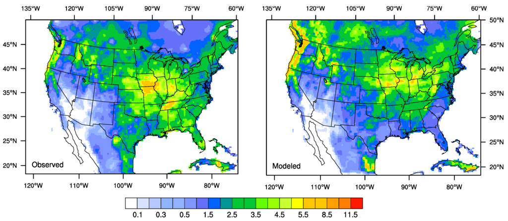 Spatial distribution of three-month average daily precipitations (mm) from the rain gauge measurements (left); and NU-WRF NoACR experiment (right).