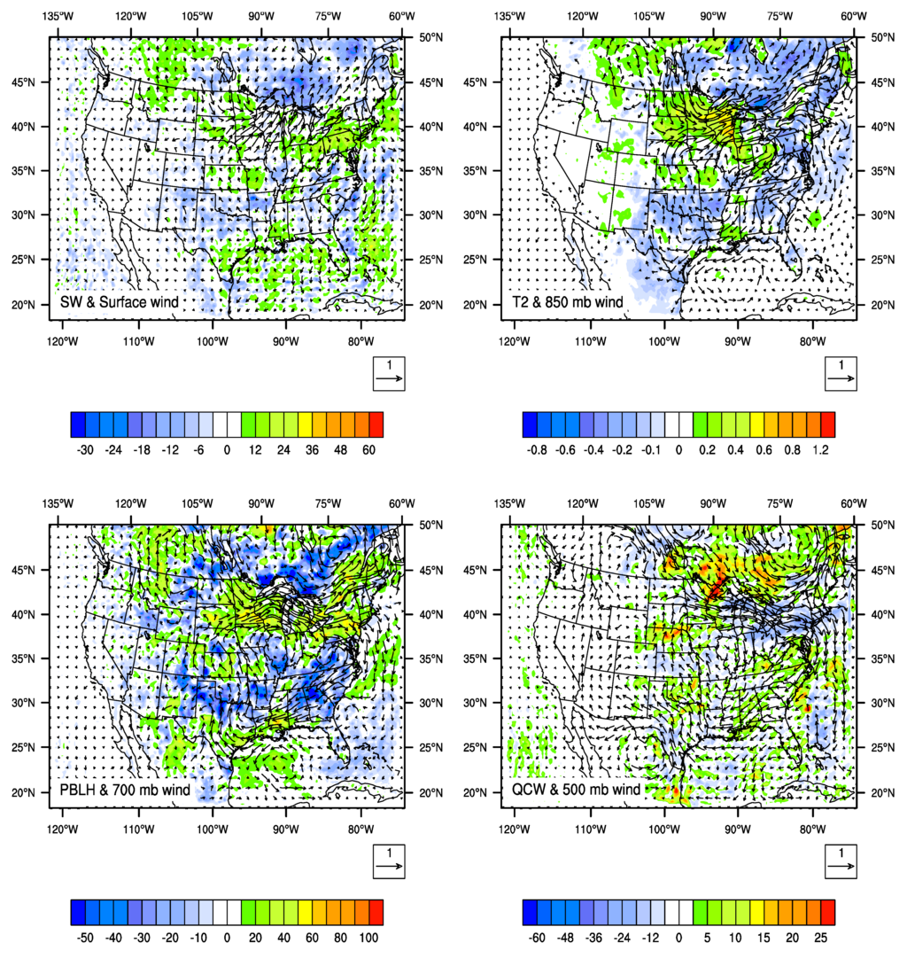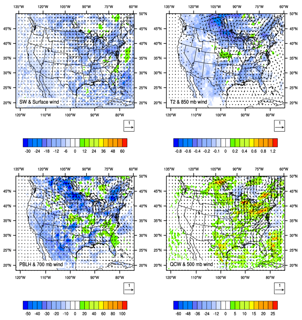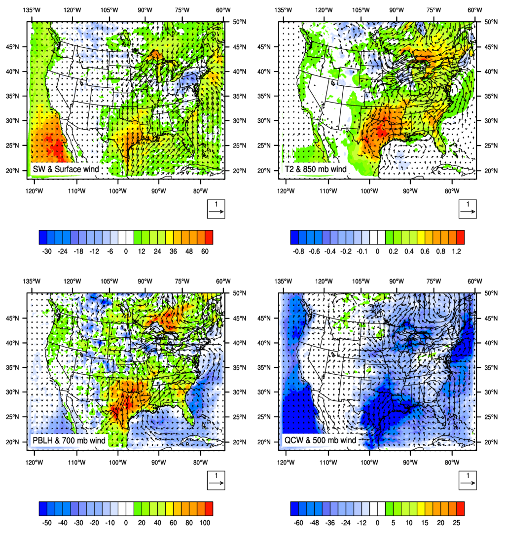 The meteorology responds profoundly to ACR interactions. In this study, we focused on several meteorological parameters that were most relevant to the surface air quality, including downward shortwave radiation, the temperature at 2 meters (T2), PBLH, cloud liquid water path (the vertical integration of cloud water content), and wind vector. These parameters directly impact the biogenic and dust emissions, photochemistry, horizontal/vertical transport, and mixing. Figure 1 shows the three-month average downward shortwave radiation, T2, PBLH, and cloud liquid water path from the NoACR experiment. Wind vectors at the surface, 850 mb, 700 mb, and 500 mb, were overlaid respectively on the downward shortwave radiation, T2, PBLH, and cloud liquid water path plots. As expected, the average T2 had a south-north gradient of about 20 K over the domain. The drier southwestern U.S. endured more than 350 W·m−2 of downward shortwave radiation and less than 1 g·m−2 of cloud liquid water path with the average PBLH well above 1000 m. The eastern U.S. generally experienced a shallower PBLH (a few hundred meters) and higher cloud liquid water path (more than 35 g·m−2 over most areas). At the surface and lower atmosphere (e.g., 850 mb), the northerly wind dominated over the Pacific coast. In the Gulf of Mexico, the prevailing wind blew from the east and veered north into Texas before turning east out to the Atlantic. In the free troposphere (e.g., 700 mb and 500 mb), the strong westerlies dominated the entire domain.