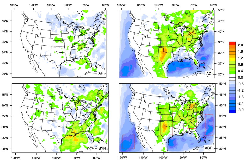 The AR effect tended to weaken the surface wind blowing from the Gulf of Mexico to Texas and to reduce the air movement out of the northeast U.S. into the Atlantic. This condition favored the pollution built-up in the aforementioned already polluted areas. In the free troposphere (700 mb and 500 mb), the AR effect was generally to weaken the western wind in the east U.S. It was worth noting that the wind change induced by the AR effect allowed more moist air from the oceans into the land in the free troposphere. The moist air typically converged in the regions covering Texas and Louisiana, as well as in the northeast to midwest U.S. This may contribute to the enhanced cloud liquid water path found in those areas.