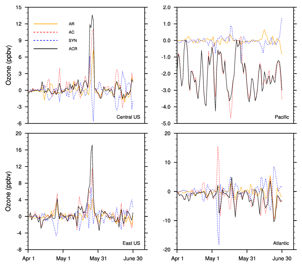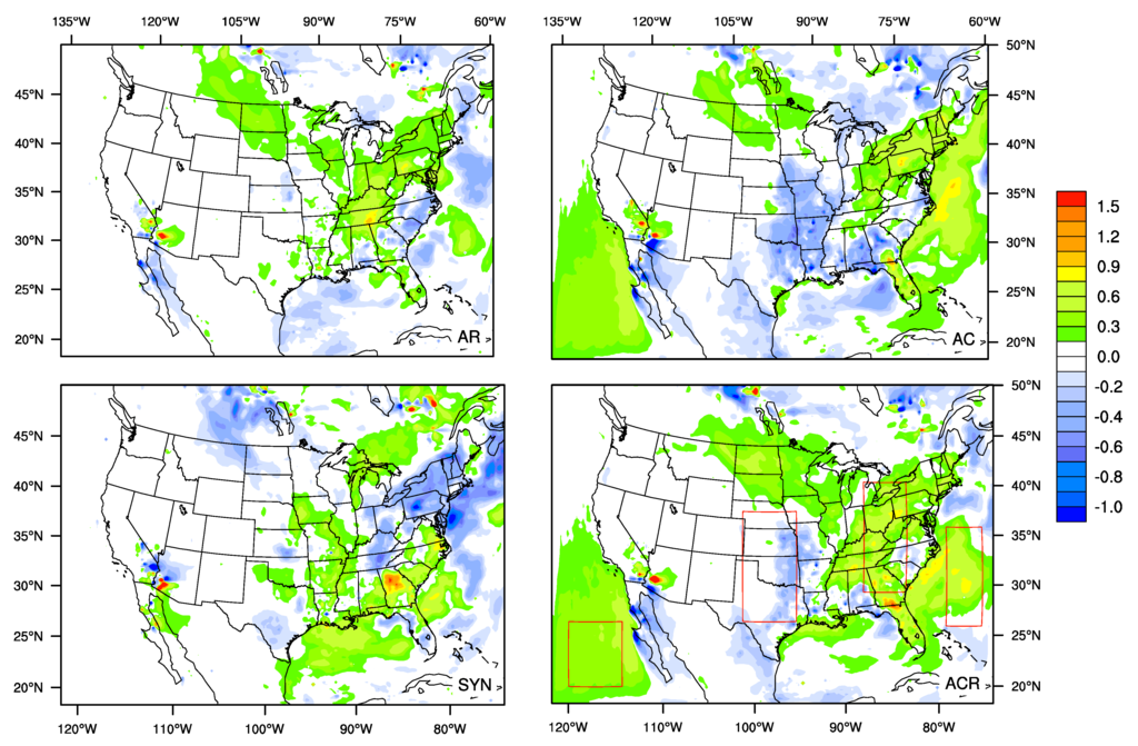 - The ACR interaction-induced meteorology change would impose noticeable effects on surface ozone and PM2.5, especially over oceans and the eastern U.S. Domain-wide, ACR interactions caused an approximately 0.4 ppbv reduction and 0.1 μg·m−3 increase in three-month average surface ozone and PM2.5 concentrations, respectively. However, the spatial-temporal variations were large and a more than 10 ppbv surface ozone and a 5 μg·m−3 PM2.5 difference induced by the ACR interactions occurred frequently in the eastern U.S. and the Atlantic Ocean. The mechanism that led to surface PM2.5 and ozone change varied from region to region, dependent upon the local chemical background (e.g., NOx- vs. VOC-sensitive regime), emissions, and meteorological conditions.
