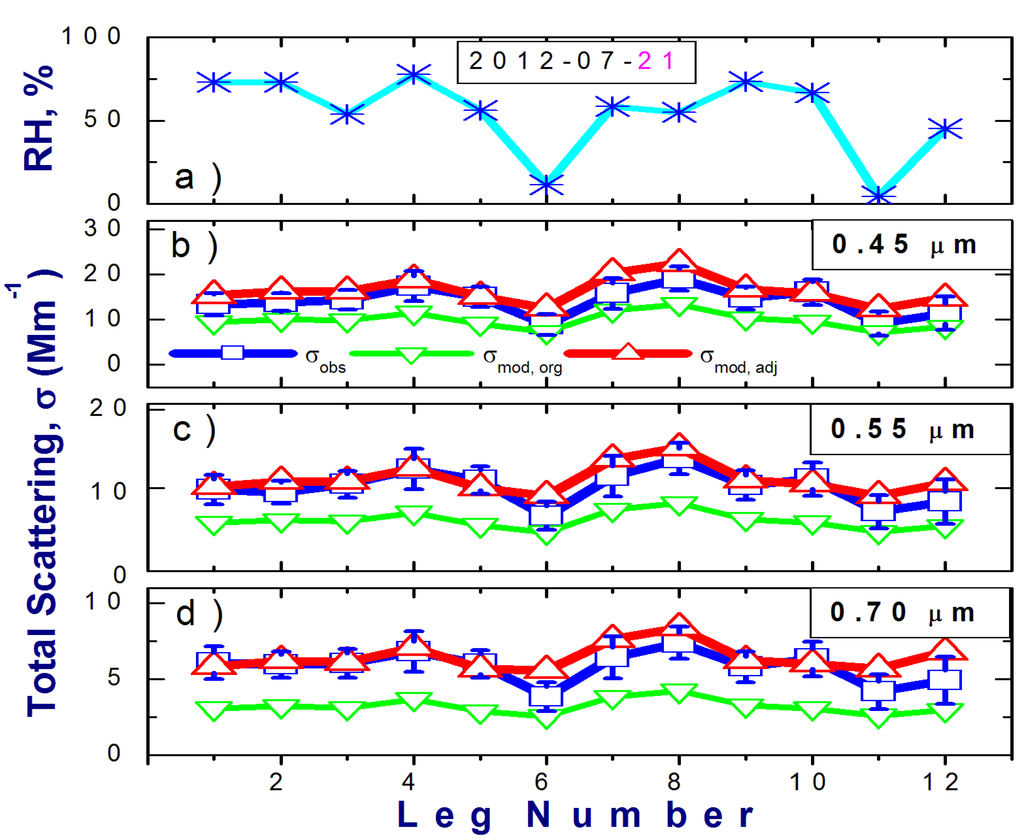 Ambient RH (a) and spectral values (b–d) of the total scattering coefficient measured (blue) and calculated for the original (green) and RI-based adjusted (red) size distributions for twelve FLs on 21 July 2012 at three wavelengths: (b) 0.45; (c) 0.55 and (d) 0.70 µm. Error bars represent uncertainties of measured scattering coefficient.