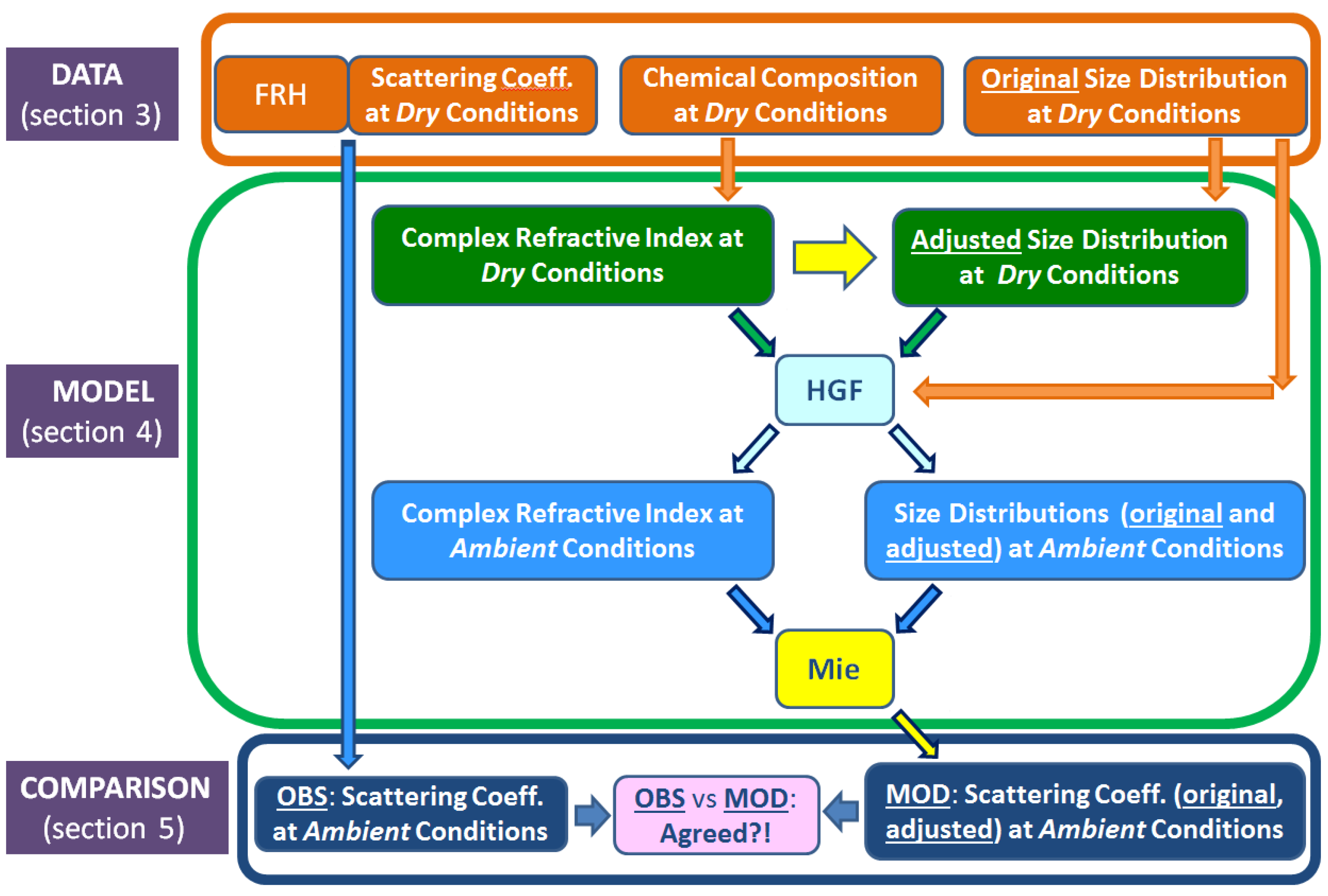 Schematic diagram summarizing the framework for an optical closure experiment using airborne data. The figure illustrates the link between the measured dry and ambient scattering coefficients (left part of diagram; top and bottom panels) and the connection between the measured dry chemical composition/size spectra and the calculated ambient scattering coefficient (center and right parts of diagram). Ambient size spectra (light blue, right) are obtained from the dry size distributions without (orange) and with (green) the RI-based correction, respectively. The estimated ambient size spectra (light blue, right) together with the ambient RI (light blue, left) are required as input for Mie calculations (yellow) of the corresponding total scattering coefficients (navy blue, right). See indicated text section for details of each component (Data, Model, Comparison).