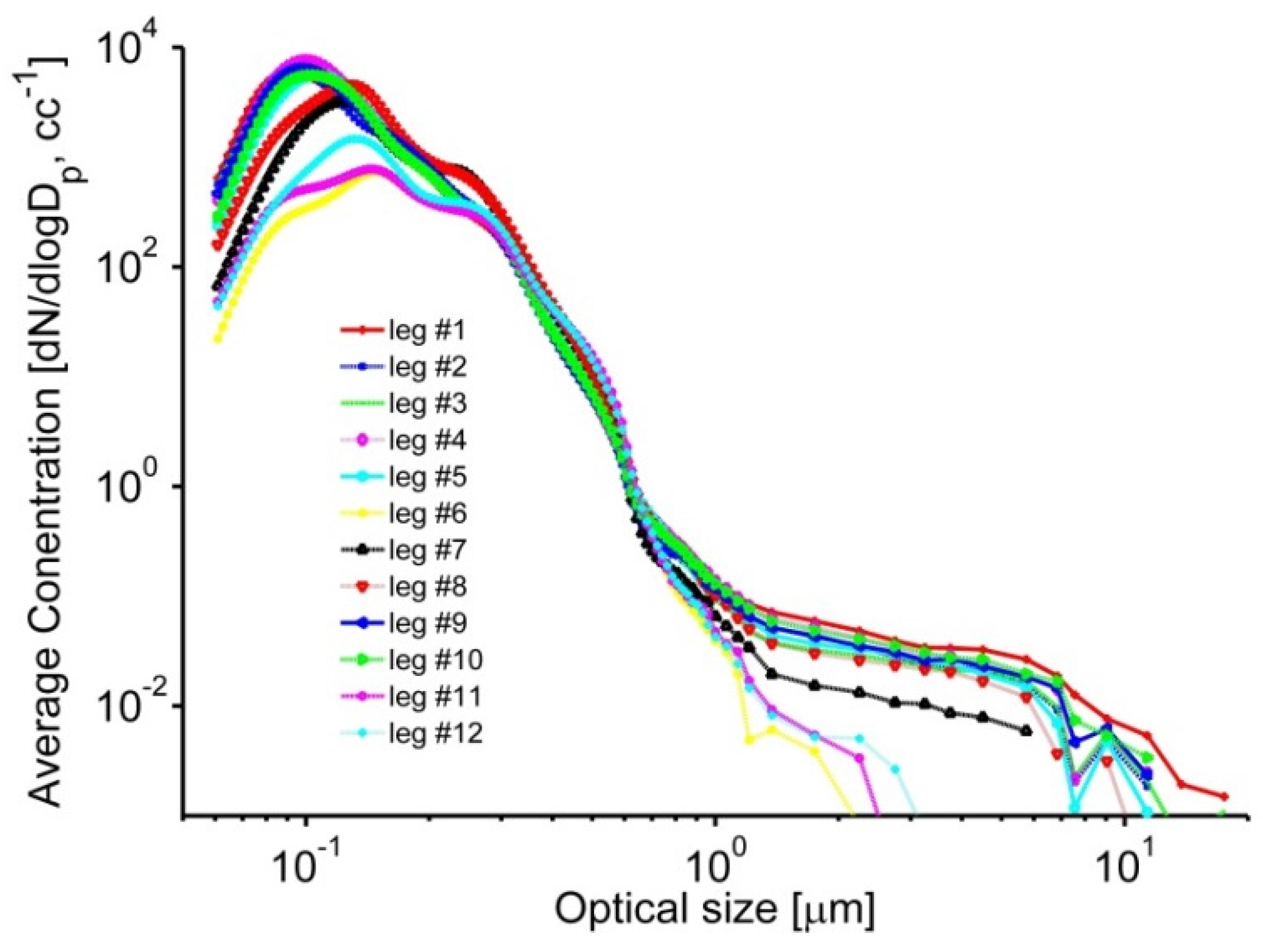 Example of combined size distributions generated for each FL during a given day (21 July 2012). Here and in the following plots, aerosol characteristics represent FL-averaged values. Elevation and time of each FL are shown in Figure 3.