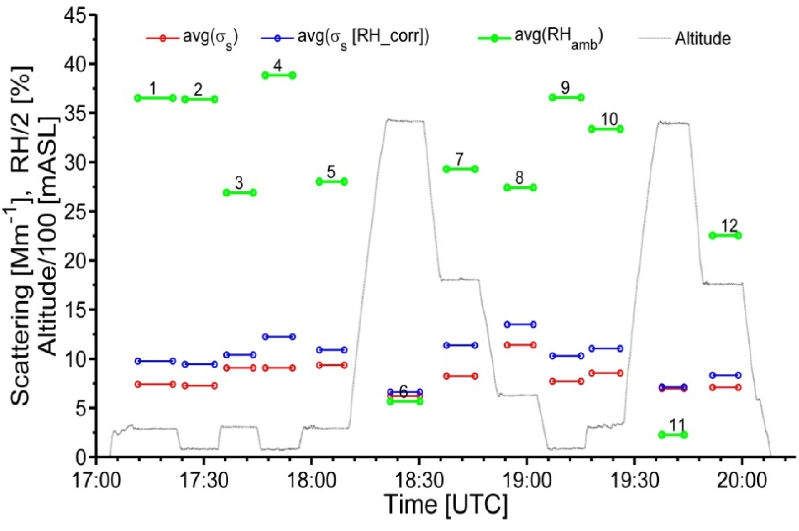 The total scattering coefficient at three wavelengths (0.45, 0.55, 0.7 µm) was measured at dry (RH < 20%) conditions using a TSI integrating nephelometer (Figure 4), while the light scattering hygroscopic growth, known as f(RH), was measured using a humidification system at three defined RHs (near 45%, 65% and 90%) at a single wavelength (0.525 µm) [51]. Similar to Shinozuka et al. [52], we adjust the f(RH) obtained at the 0.525 µm wavelength to the nephelometer wavelengths (0.45, 0.55, 0.7 µm) by multiplying the obtained f(RH) by 0.98, 1.01 and 1.04, respectively. The conventional truncation error correction [53] has been applied to the total scattering measured by the integrating nephelometer. We obtain the total scattering at ambient conditions (σobs) at three wavelengths (0.45, 0.55, 0.7 µm) using both the adjusted f(RH) and spectrally-dependent measured dry total scattering. It is to be noted that measurement uncertainties in the reported total scattering by the integrating nephelometer are quite small (~10%) for sub-µm, but can be considerable for super-µm particles (~50%) [53,54]. For a given FL, we assume that the combined uncertainty of σobs depends on its variability within FL (defined here as the standard deviation) and the measurement uncertainty [46]. In other words, the FL-dependent combined uncertainty in the ambient total scattering coefficient is comparable with the measurement uncertainty (10%) for a homogeneous FL and can exceed it substantially for an inhomogeneous FL where the standard deviation is large.