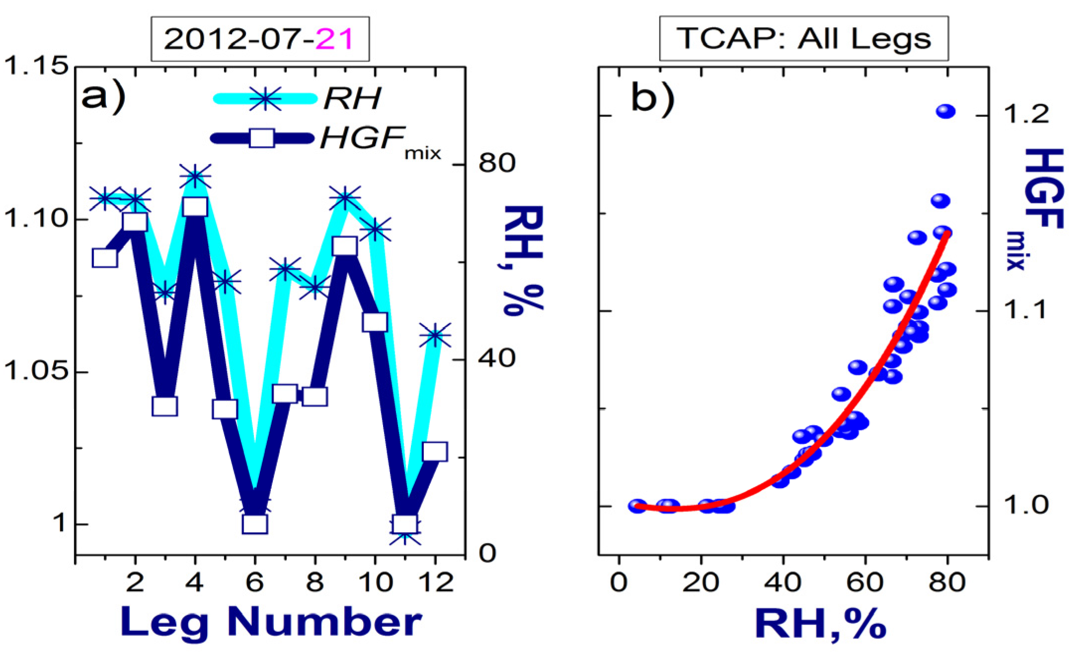 Example of ambient RH and RH-dependent HGFmix calculated for each FL during a given day (21 July 2012) (a); scatterplot of RH-dependent HGFmix (blue dots) for all TCAP FLs used in this study (Section 3) with polynomial fit (red line) (b).