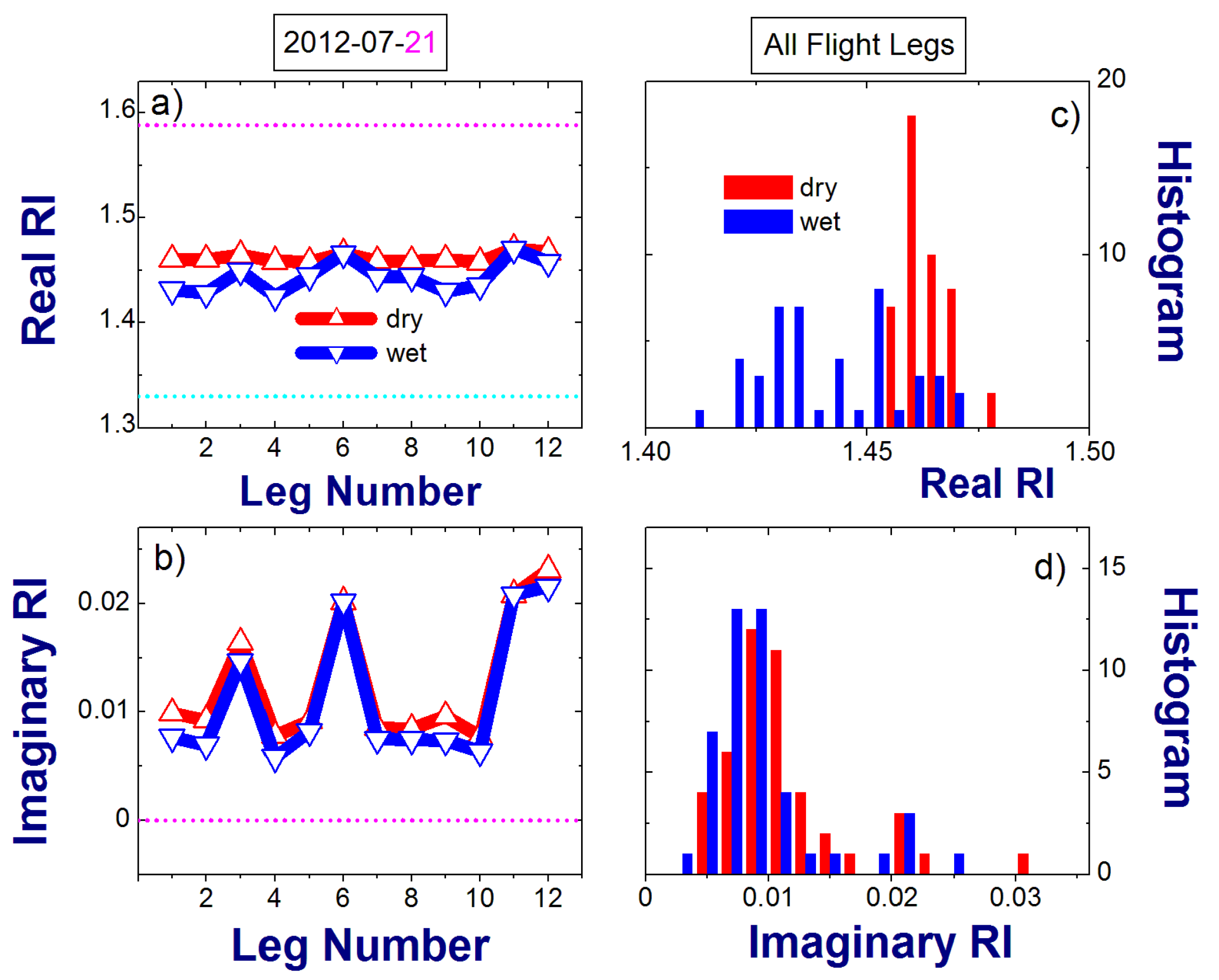Example of RH-dependent dry and ambient values of the real and imaginary parts of the complex RI calculated for each FL during a given day (21 July 2012) (a,b); the corresponding histograms obtained for all TCAP FLs (c,d). The real (nOPC = 1.588) and imaginary (kOPC = 0) parts of the complex RI used for OPC calibration are shown in (a) (magenta) and (b) (magenta), respectively. The real RI of water (nwater = 1.33) is also shown (a, cyan). The imaginary RI of water (kwater = 0) is equal to the imaginary RI used for OPC calibration (kOPC = 0).