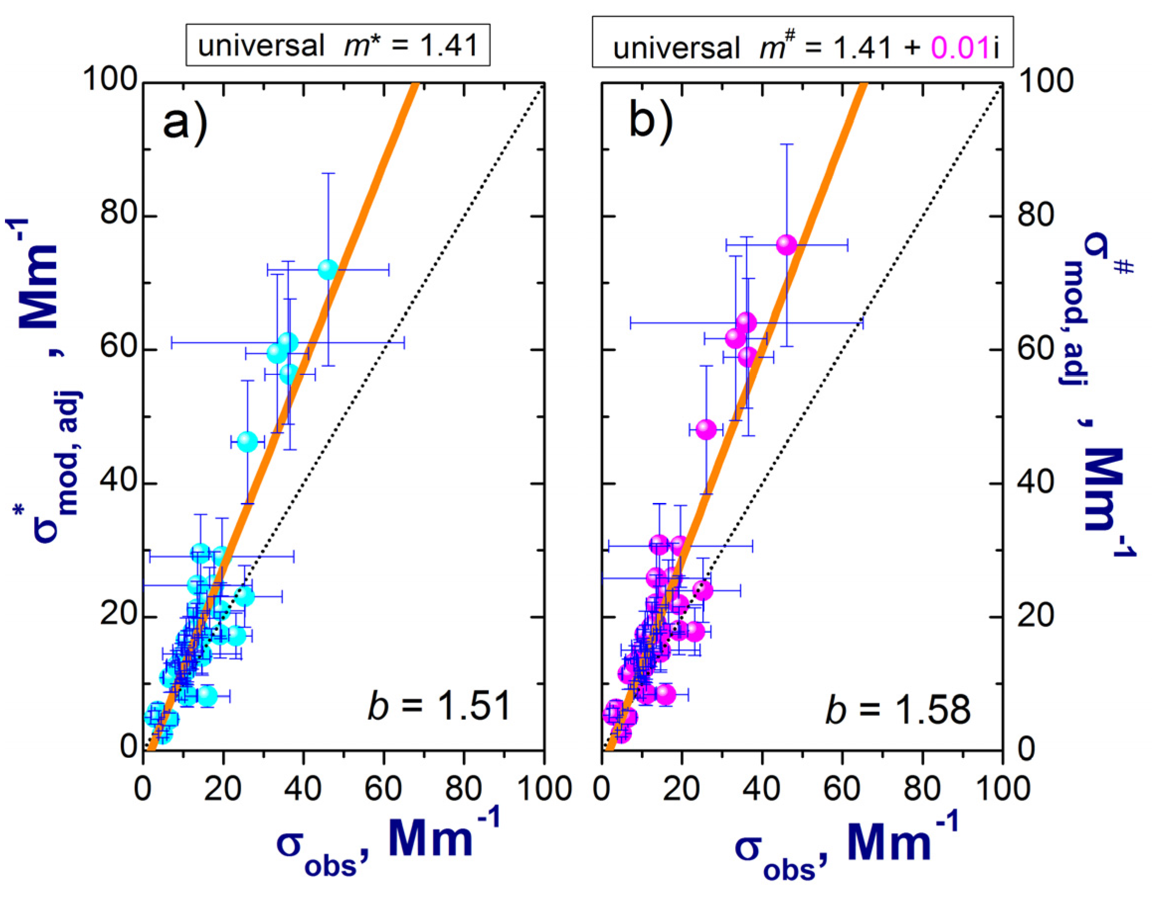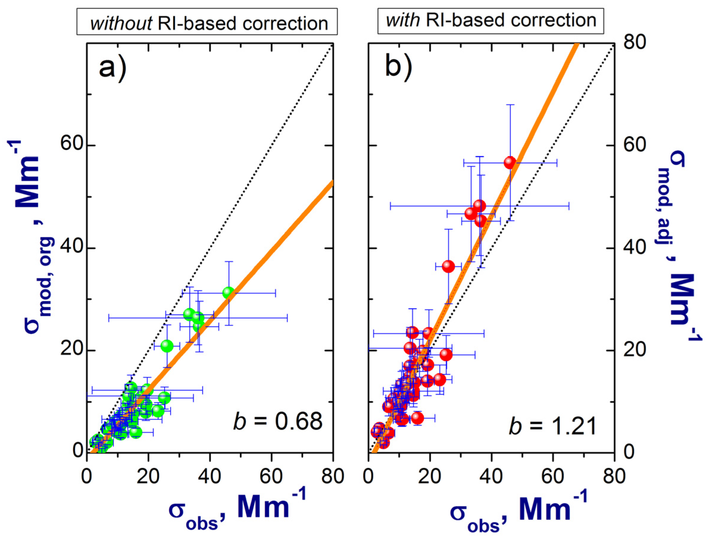 Comparison of the ambient total scattering observed (σobs) with ambient total scattering calculated (σmod) for the original (a) and adjusted (b) size distributions at 0.55 µm wavelength for all TCAP FLs. Here b is the slope of the linear regression fits to the data (straight orange lines). Error bars represent uncertainties of measured (Section 3) and calculated (Section 4.4) scattering coefficients.