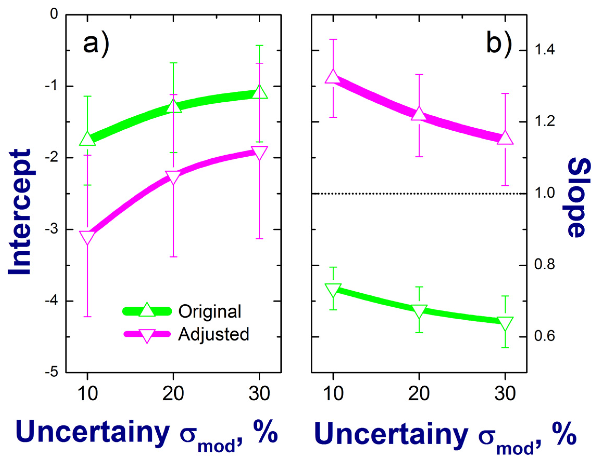 Intercept (a) and slope (b) of the linear regression fits (e.g., Figure 9) as a function of uncertainty for the ambient total scattering calculated for the original (without RI-based correction) and adjusted (with RI-based correction) size distributions. Error bars represent the standard errors of the displayed parameters (see text for details).