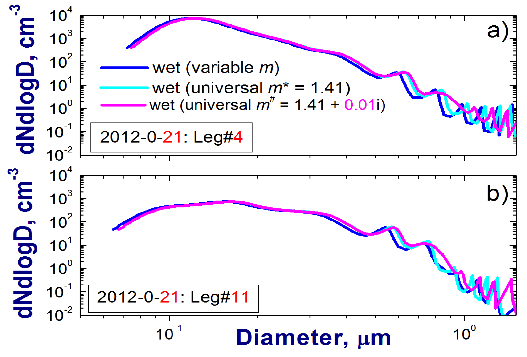 Note that functions in Equation (9) (left-hand versus right-hand side) have different arguments; for example, dN (Dwet) ∕ d log Dwet (Equation (9a); left-hand side) and dN (Ddry) ∕ d log Ddry (Equation (9a); right-hand side). In comparison with the size-dependent scaling factor (Equation (6)), the size-independent adjustment (Equation (8)) associated with water uptake modifies the original OPC-derived size spectra by changing bin boundaries only (horizontal shifting; e.g., replacement of Ddry with Dwet; Equation (9a)); this adjustment does not cause the vertical scaling of the normalized number concentration (Equation (7) versus Equation (9)).