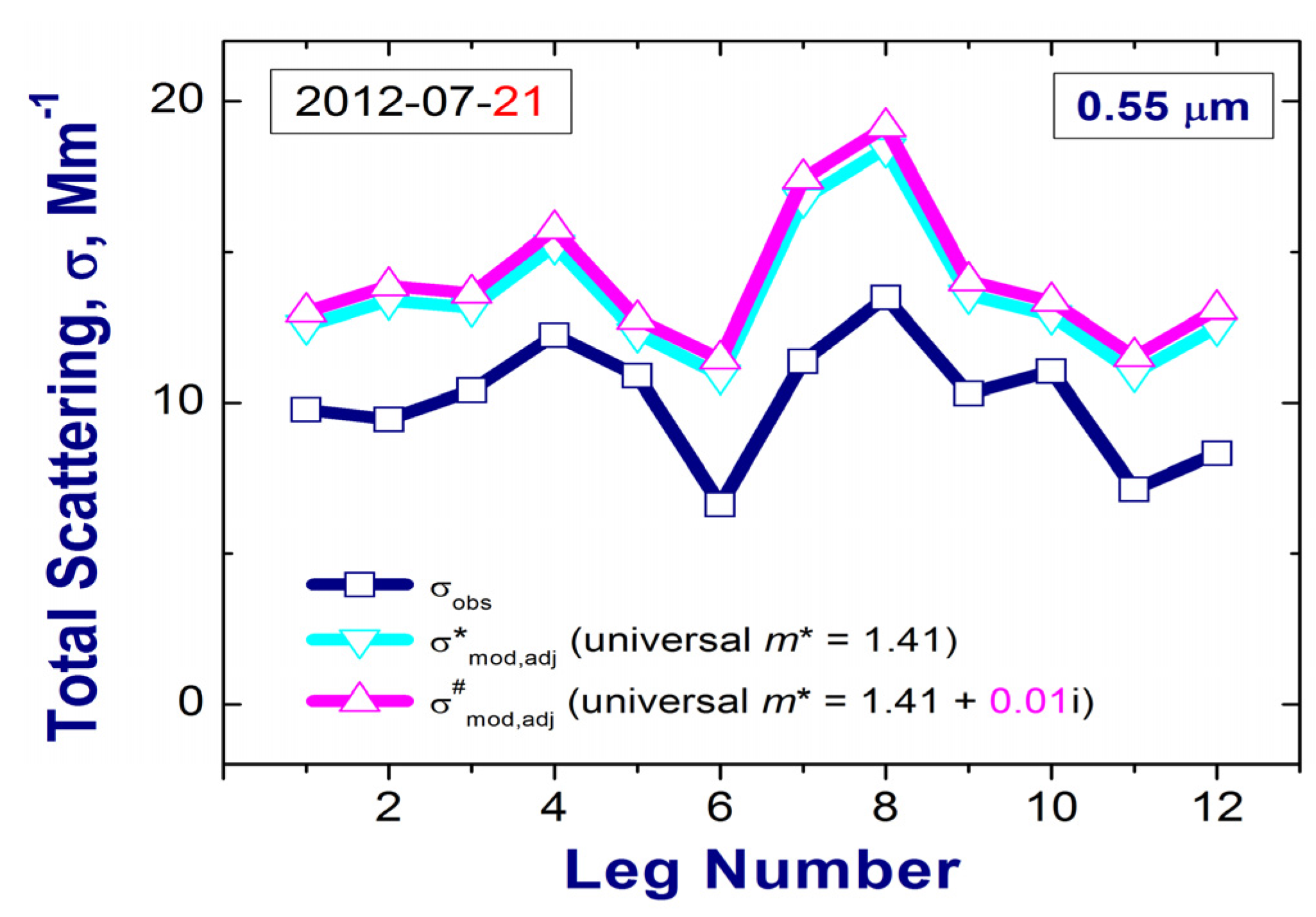 Comparable slopes for linear regression fits (σmod,adj versus σobs) are obtained at the other two wavelengths (0.45 and 0.7 µm) (Table 2). The weak spectral dependence of these slopes suggests that the complex RI obtained at 0.55 µm wavelength could be applied to estimate the spectrally-resolved total scattering within the mid-visible range (0.45–0.70 µm) reasonably well.